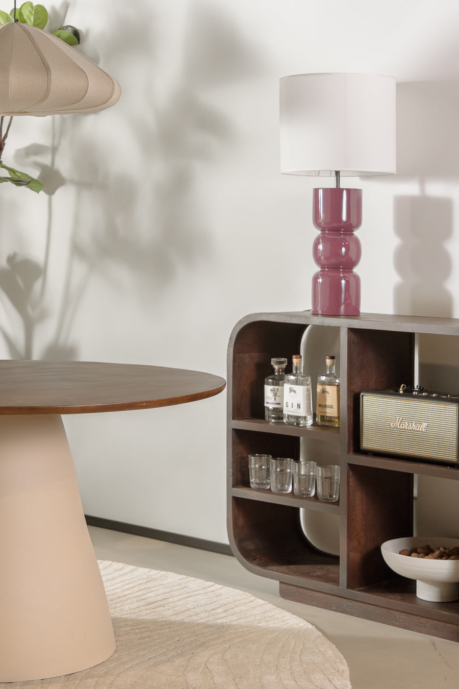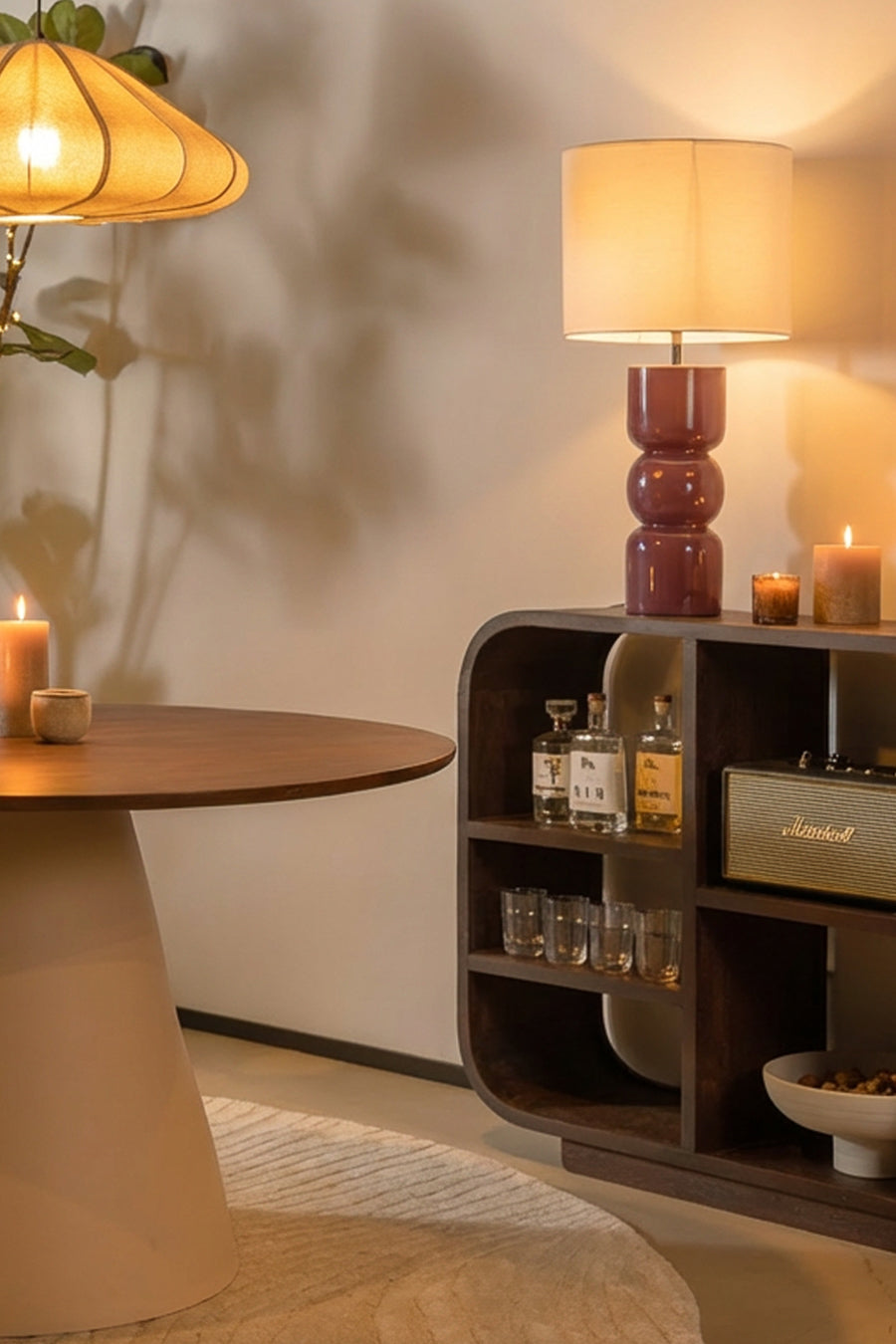 מנורת שולחן גלוסי בגוון אדמדם. גוף תאורה מעוצב בסיס גיאומטרי בגימור שייני חלק ו-אהיל פשתן עגול.