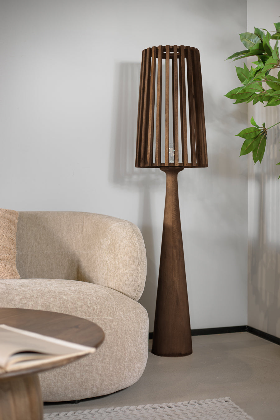 מנורה ווד לוסט בגוון חום עמוק. מנורת ריצפה מעוצבת אהיל גלילי ורגל קונוס מעץ מנגו .