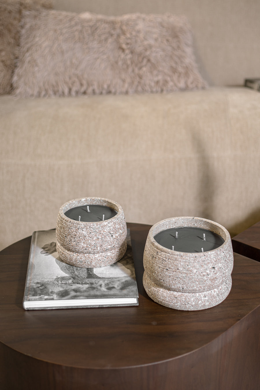 נר צמנטו בגוון אפור. נר יצוק בכלי קיבול אמורפי בגימור מחוספס.