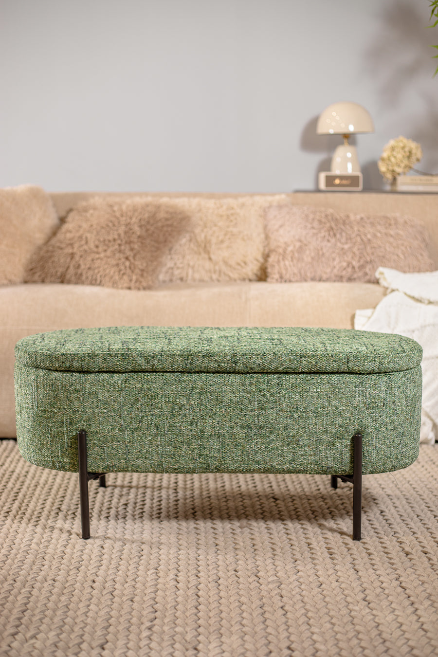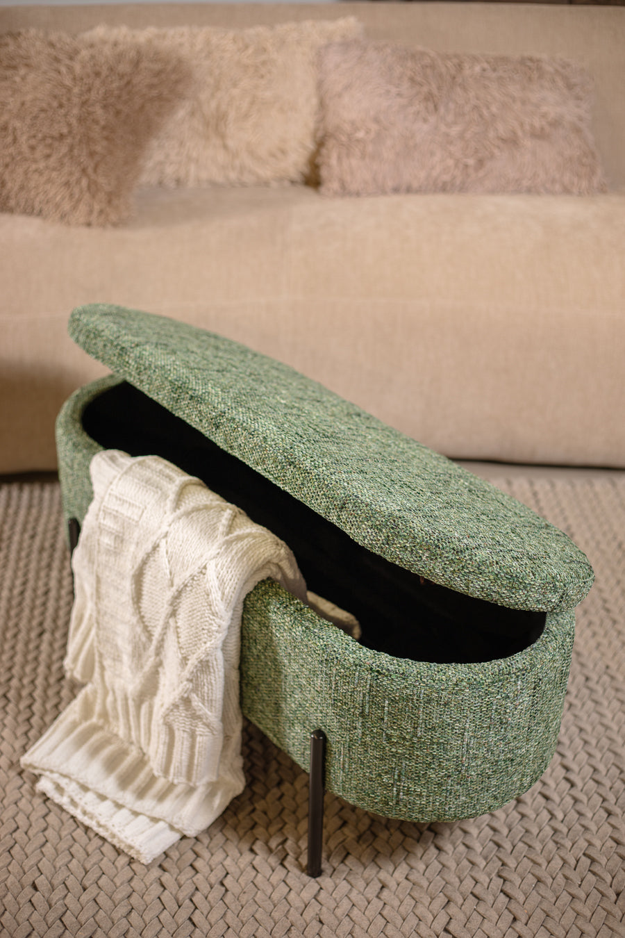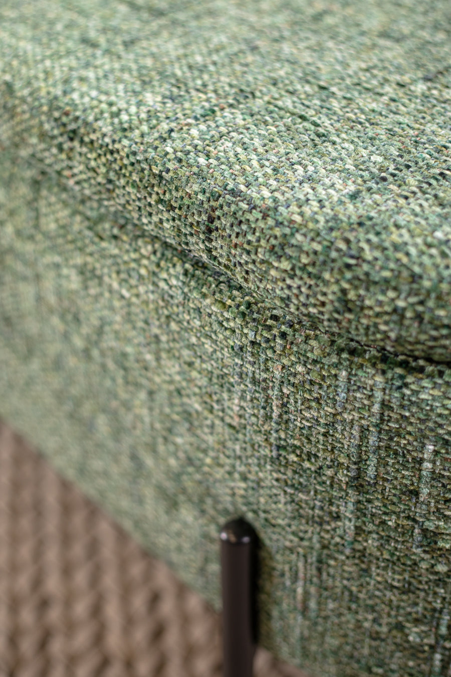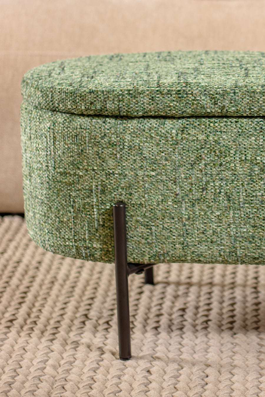 סטול איחסון לוקה בצבע ירוק עד. הדום אובאלי מרופד בד טוויד שובה, הנישא על רגלי מתכת שחורות.