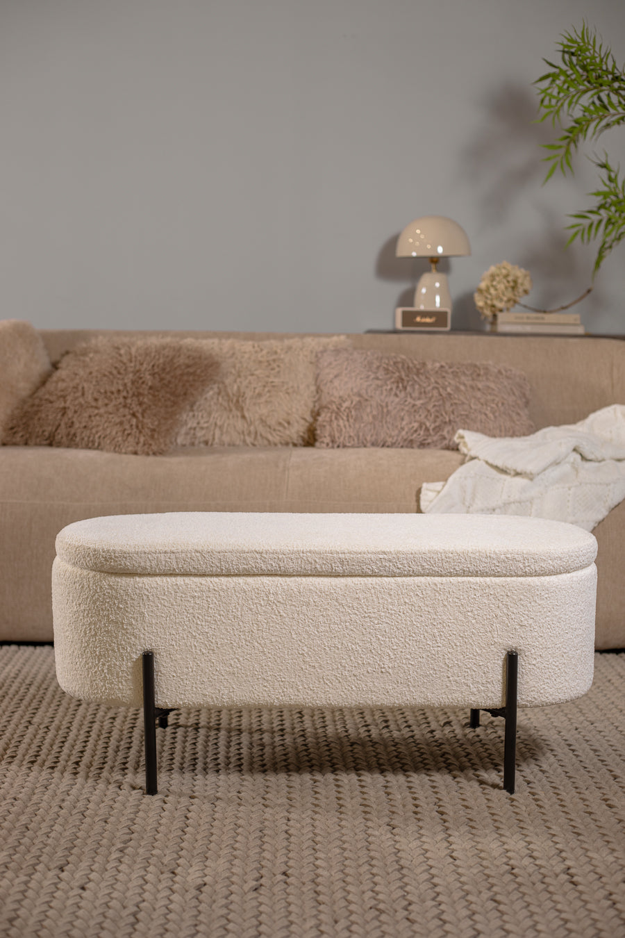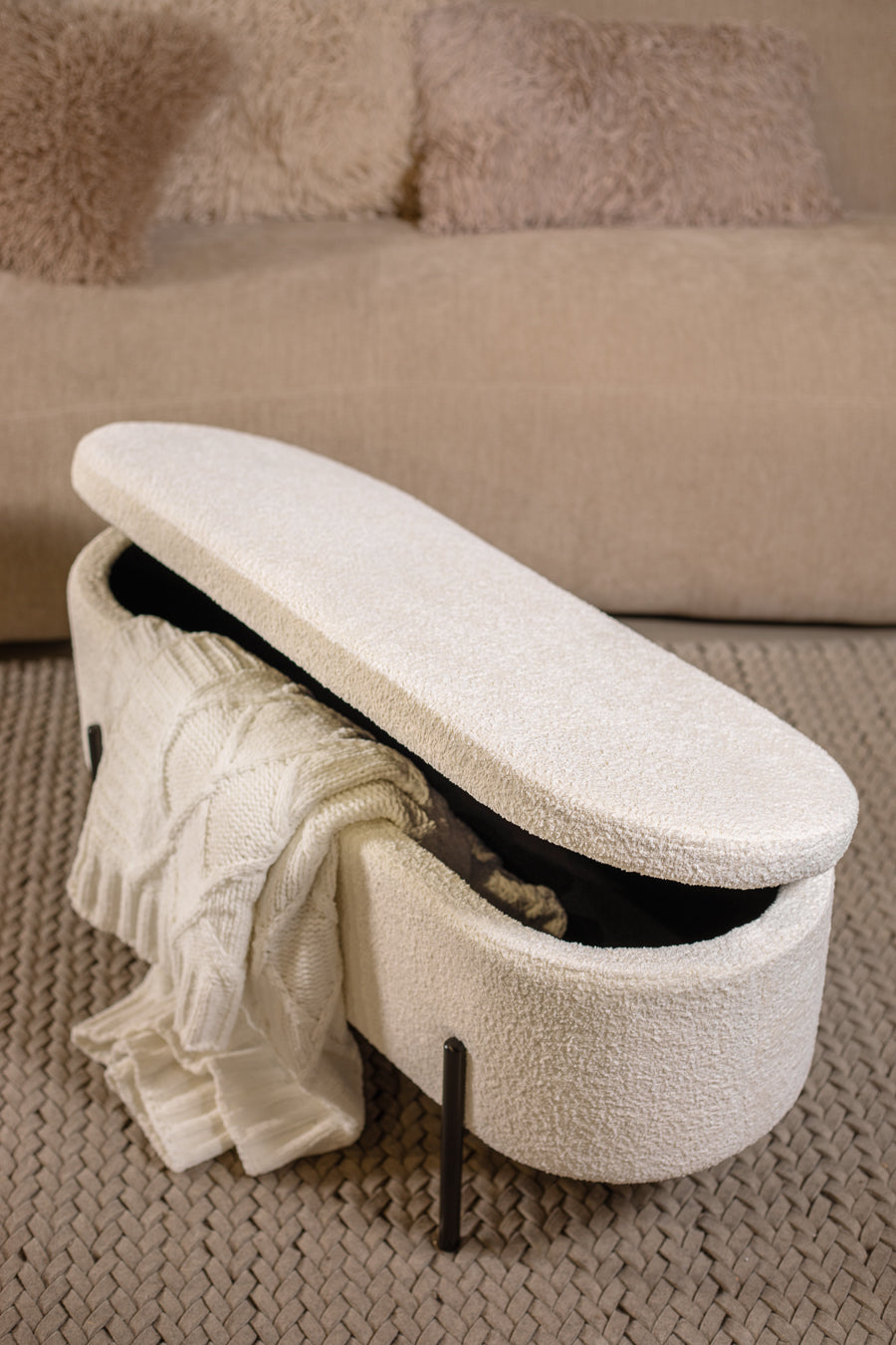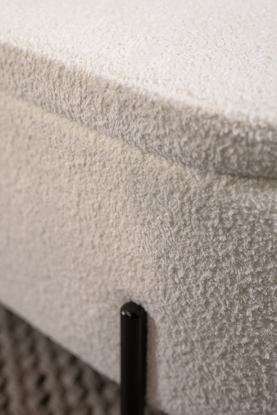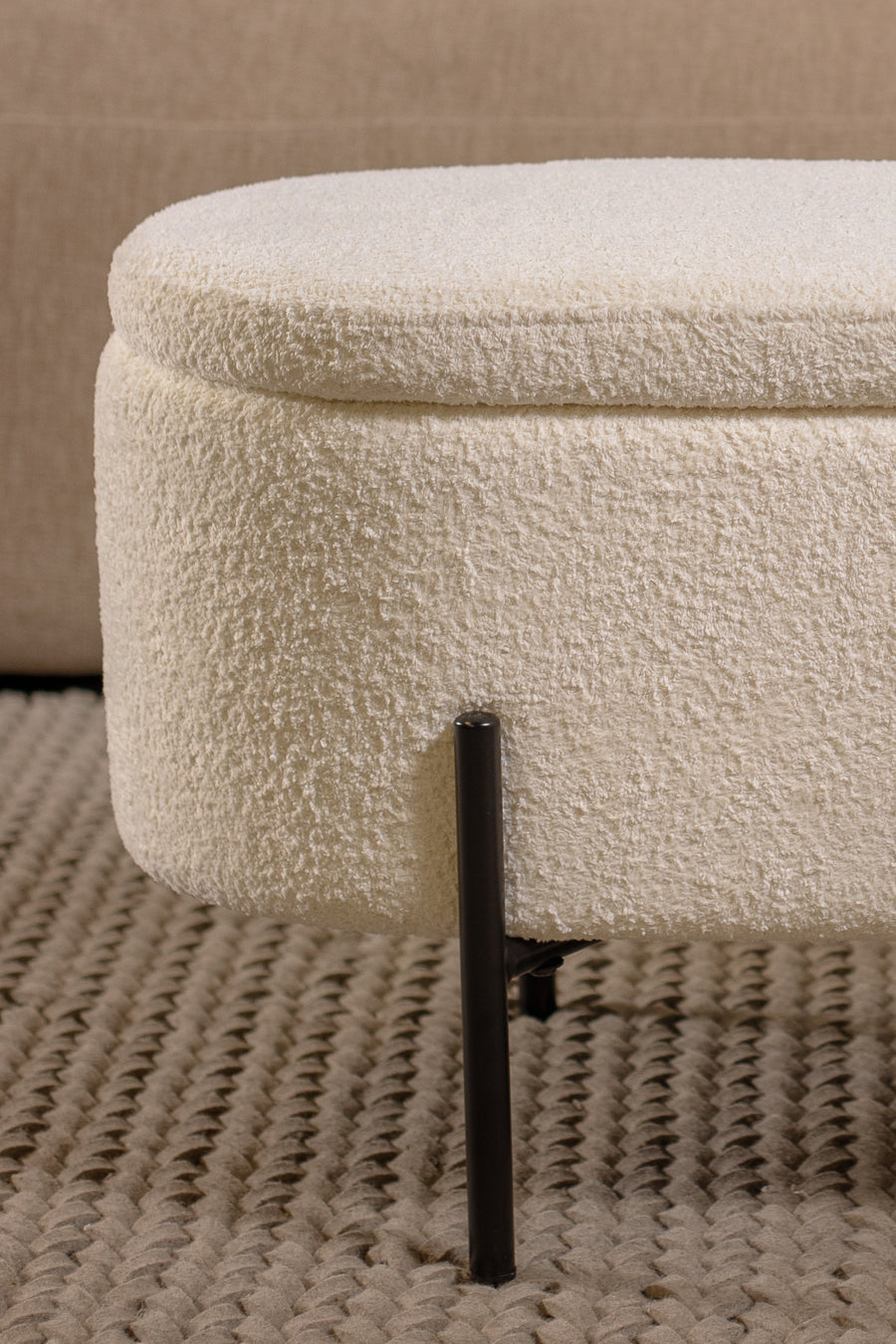 סטול איחסון לוקה בצבע לבן. הדום אובאלי מעוצב הנישא על רגלי מתכת שחורות.