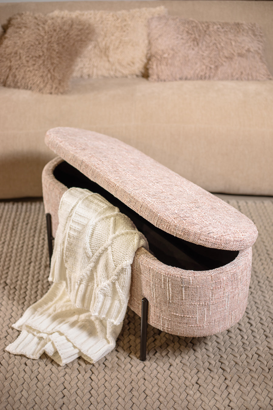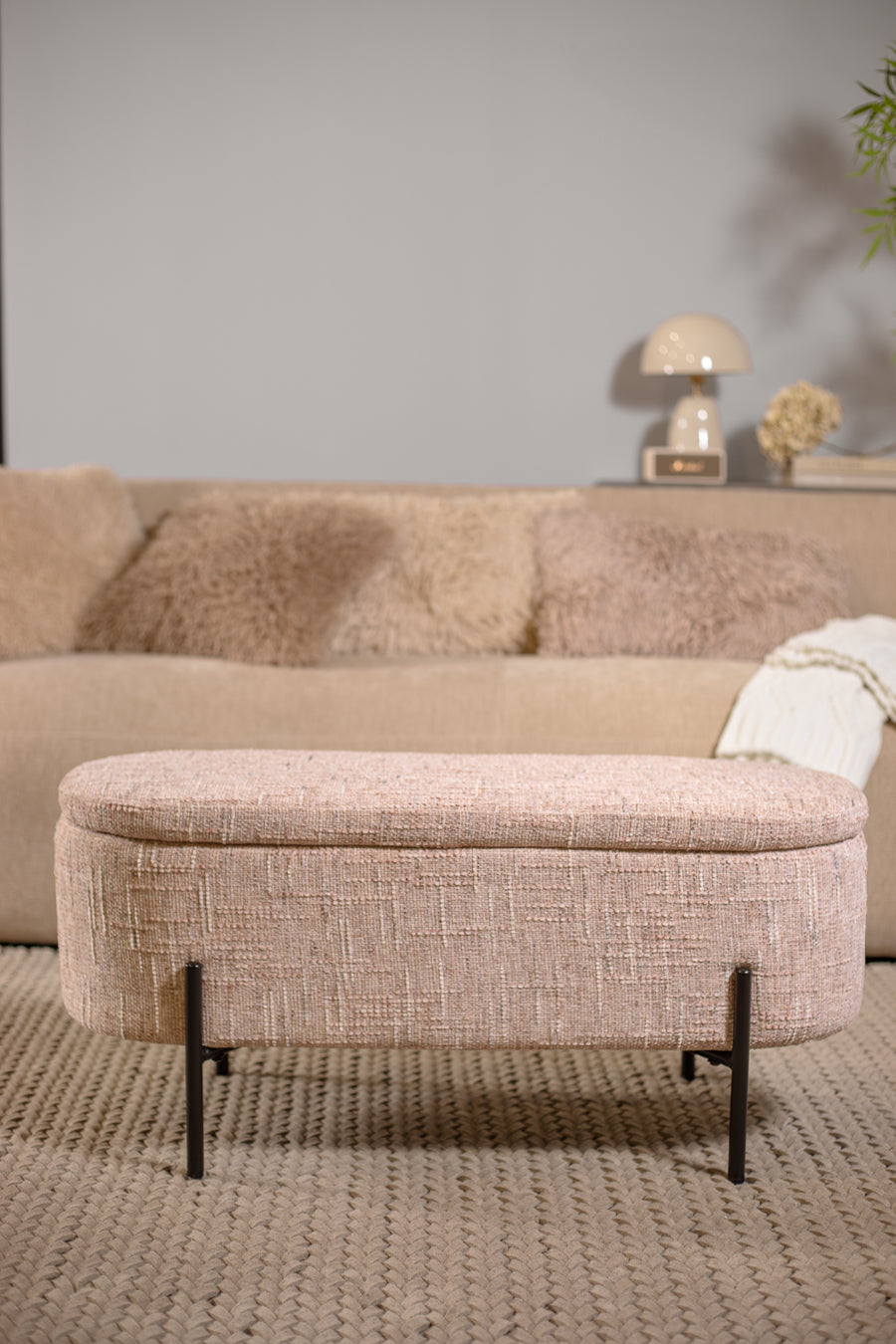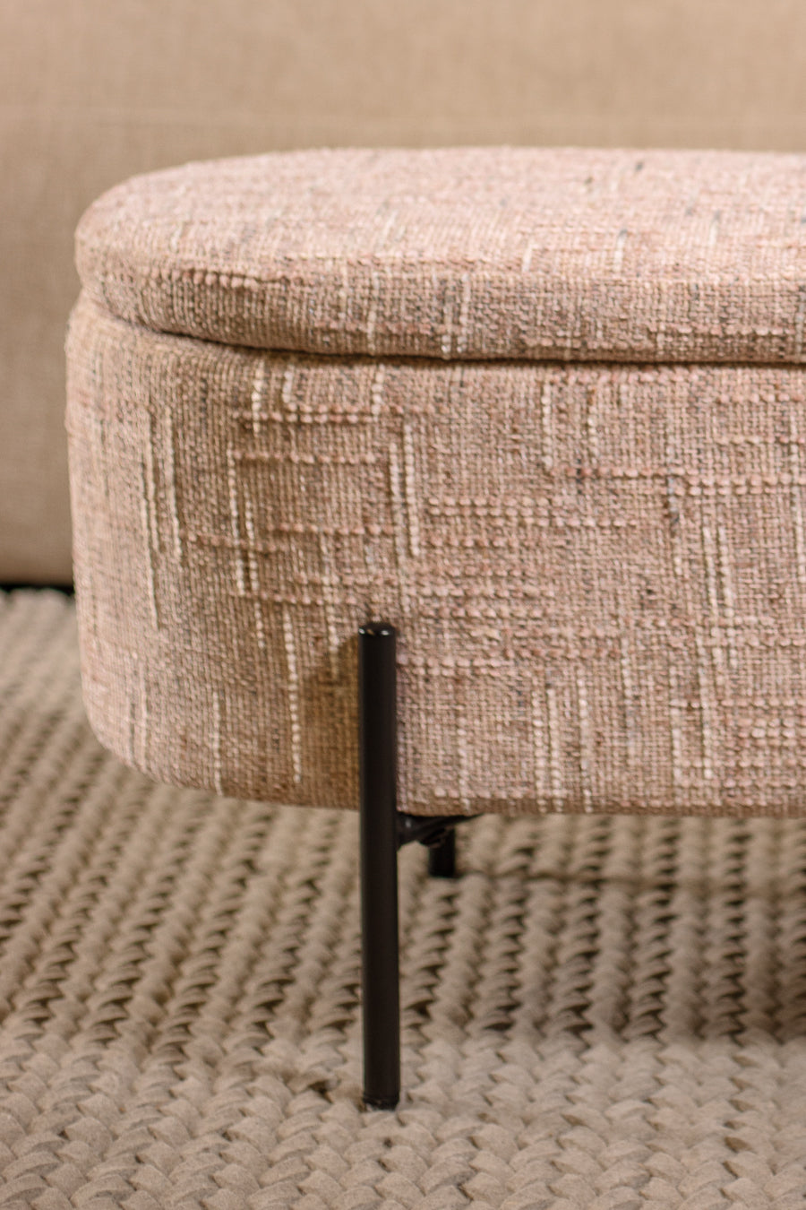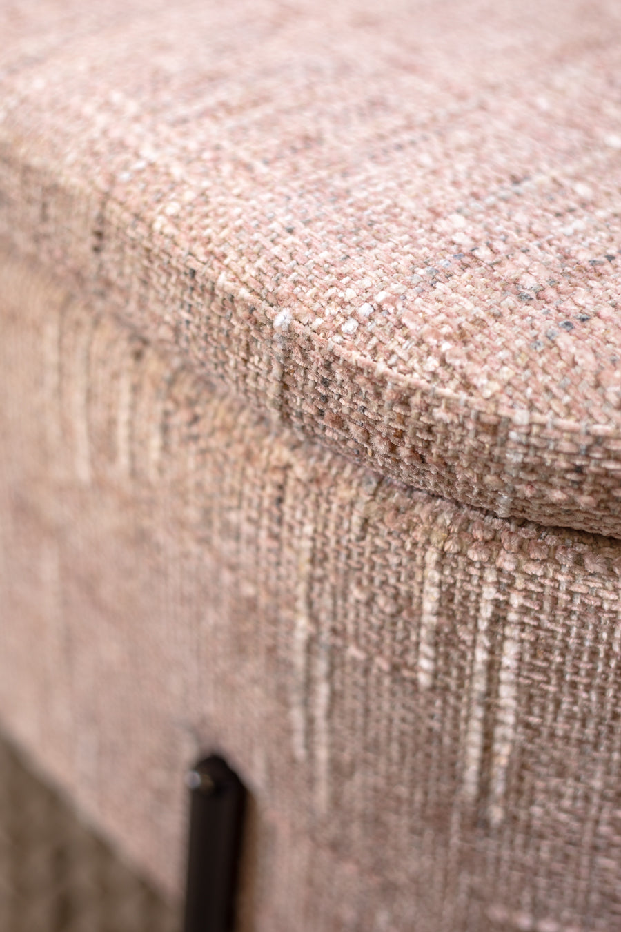 סטול איחסון לוקה בגוון ורדרד. הדום אובאלי מרופד בד טוויד שובה, הנישא על רגלי מתכת שחורות.