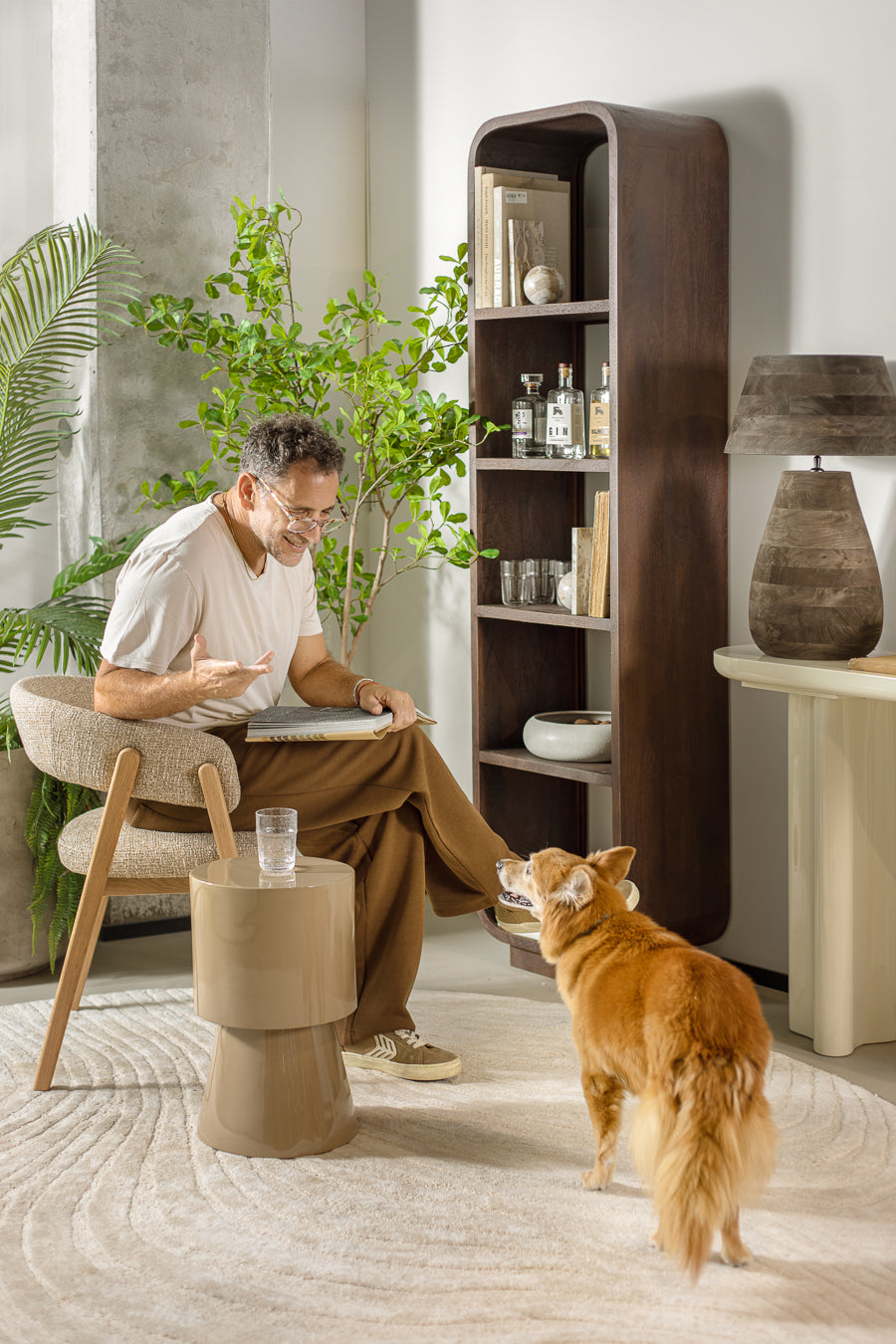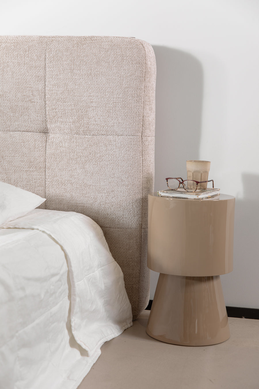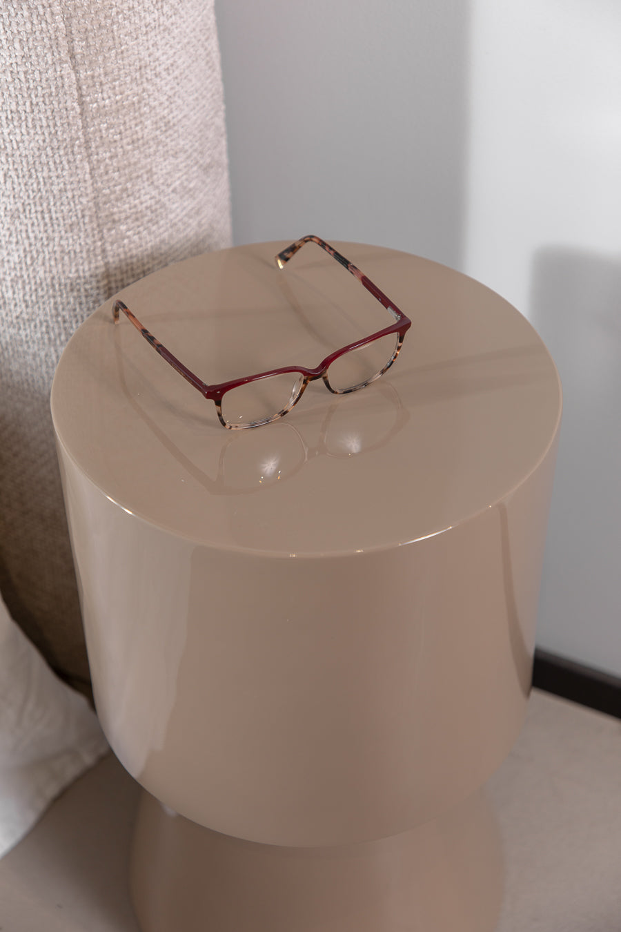 סטול גלוסי בגוון בהיר. שולחן צד בגימור קורץ המכניס טאץ' של גלאם וצבע בחלל האירוח.