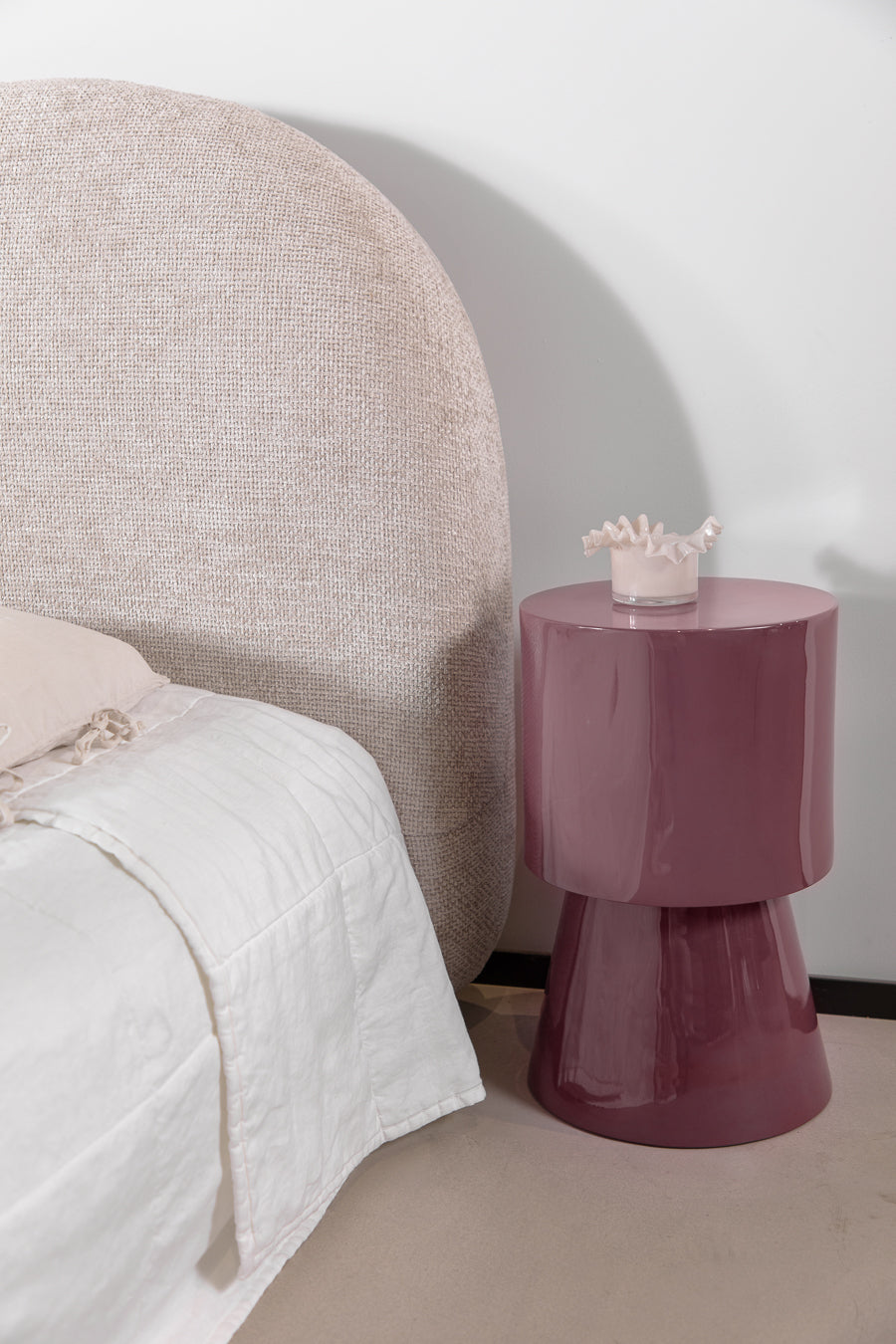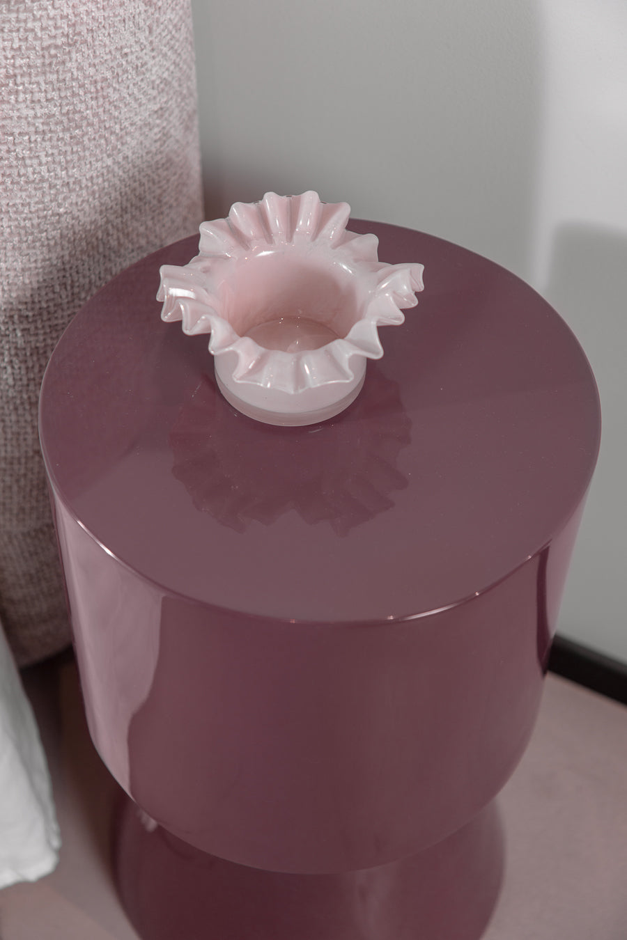 סטול גלוסי בגוון חם. שולחן צד בגימור קורץ המכניס טאץ' של גלאם וצבע בחלל האירוח.