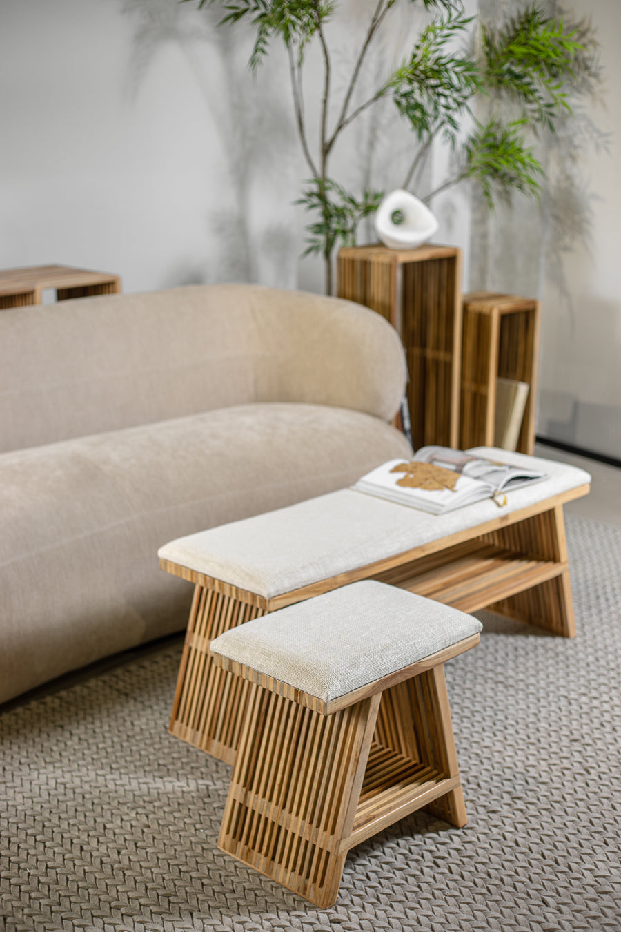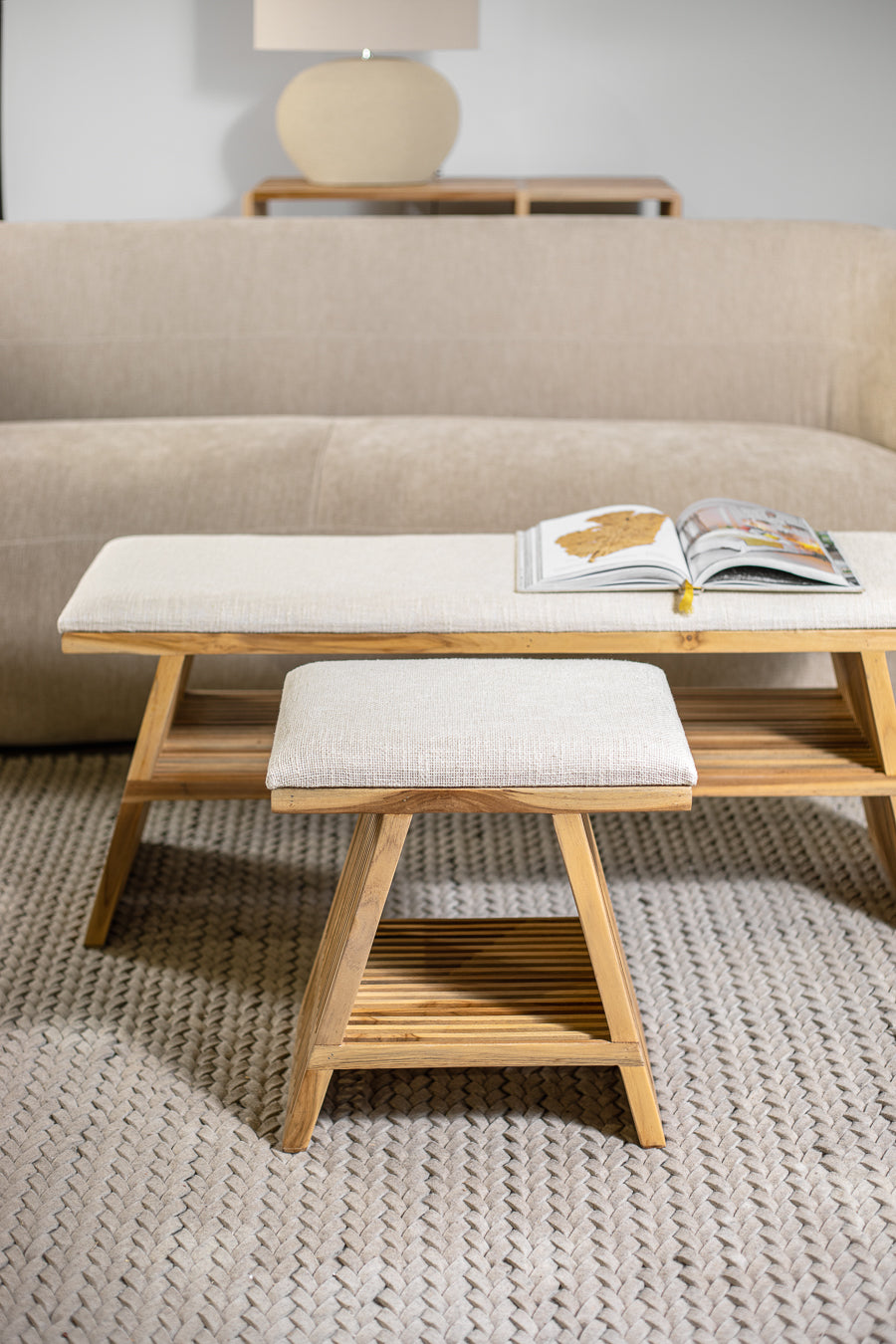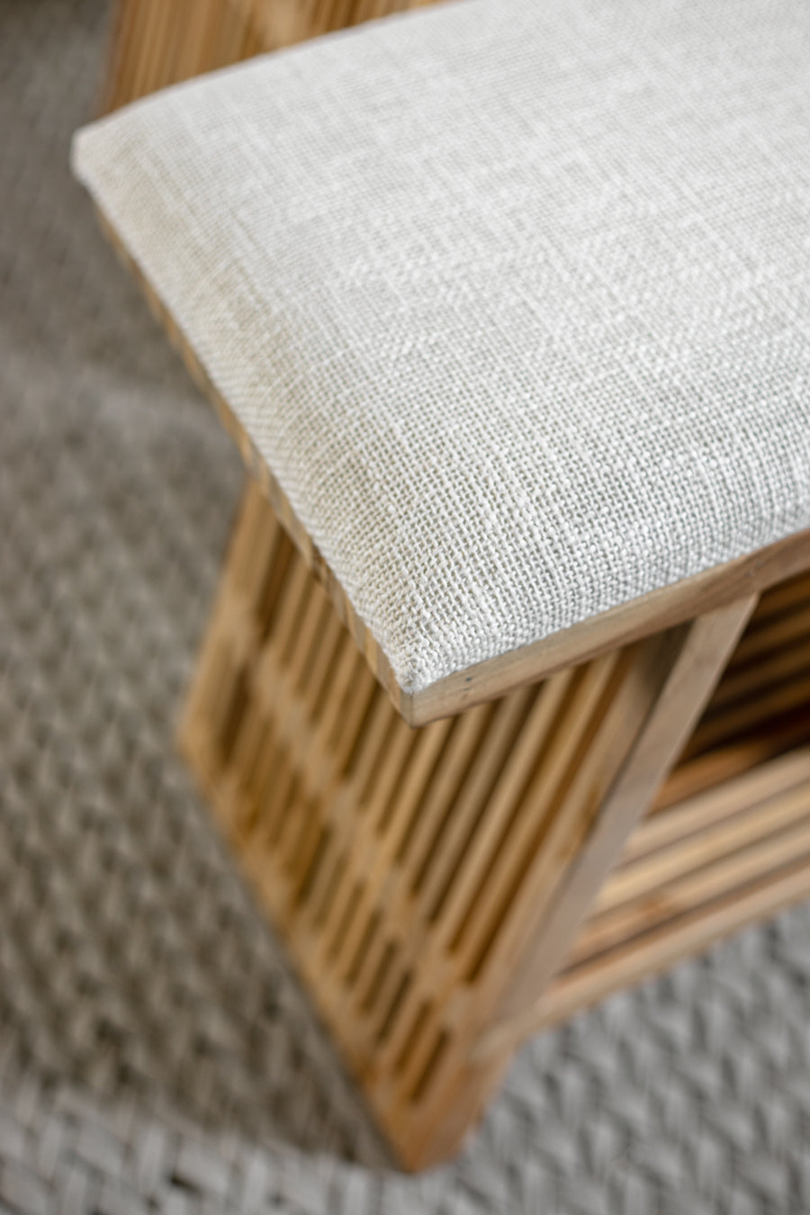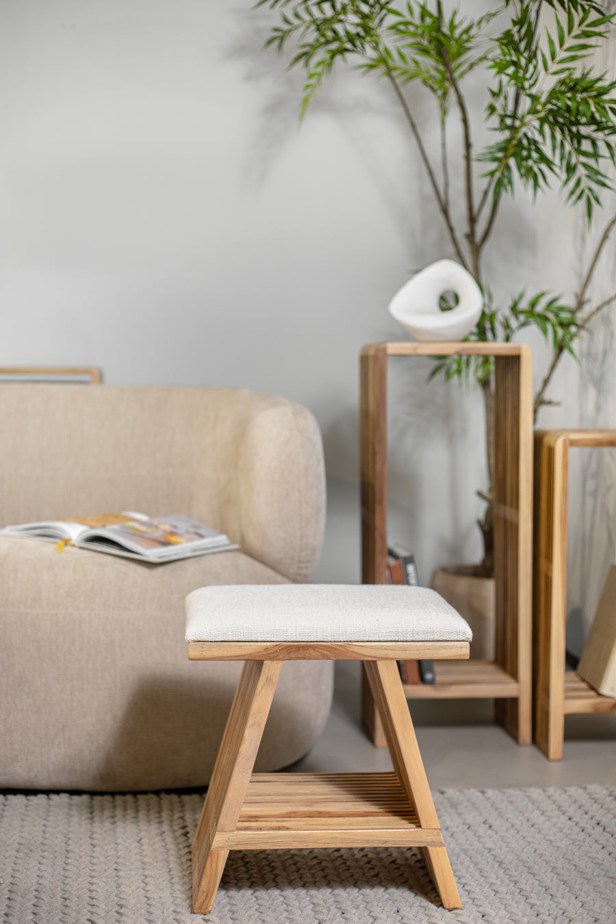 סטול ריזורט בגוון עץ טיק. סטול עץ מרופד מעוצב מדף איחסון נמוך בניראות שובה.