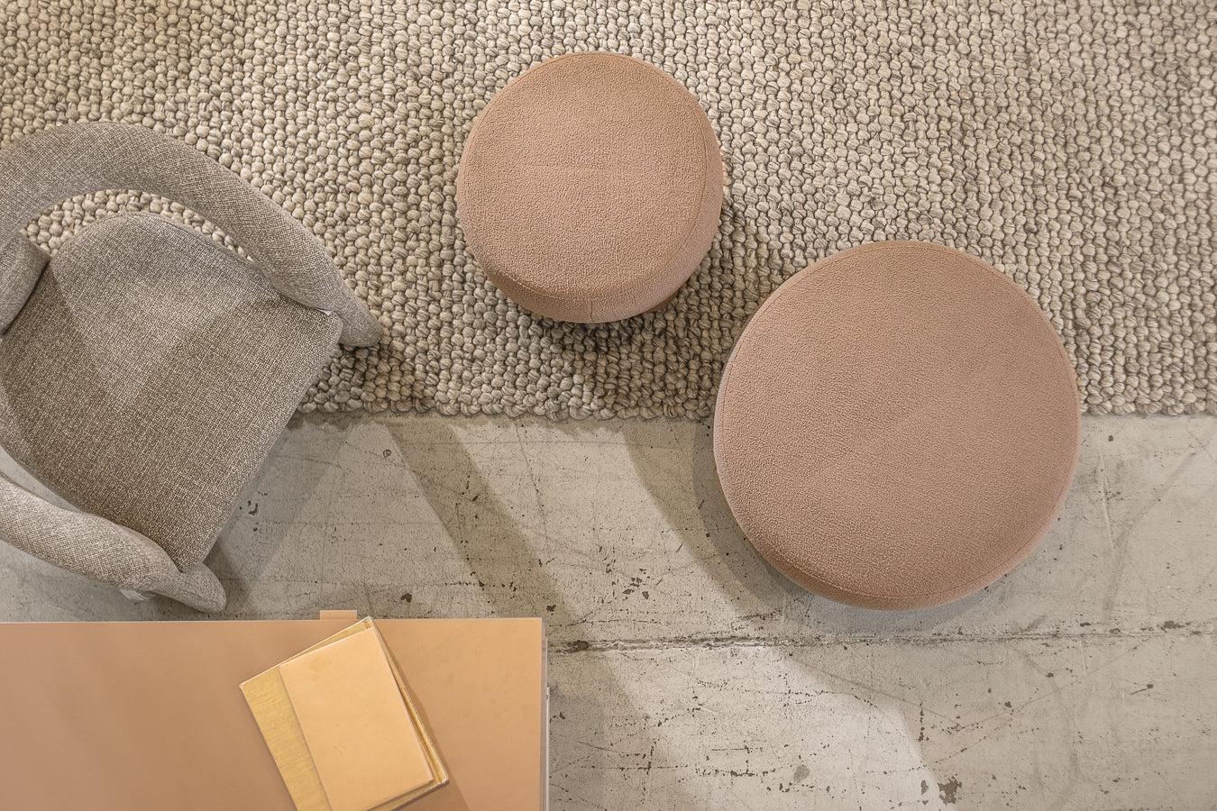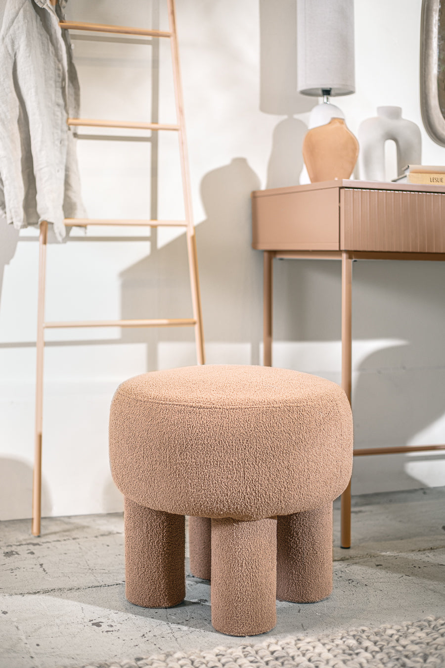 סטול ריקו עגול בצבע בז'. הדום מעוצב כרית צאבי עגולה הנישאת על 4 רגליים בגוון זהה.