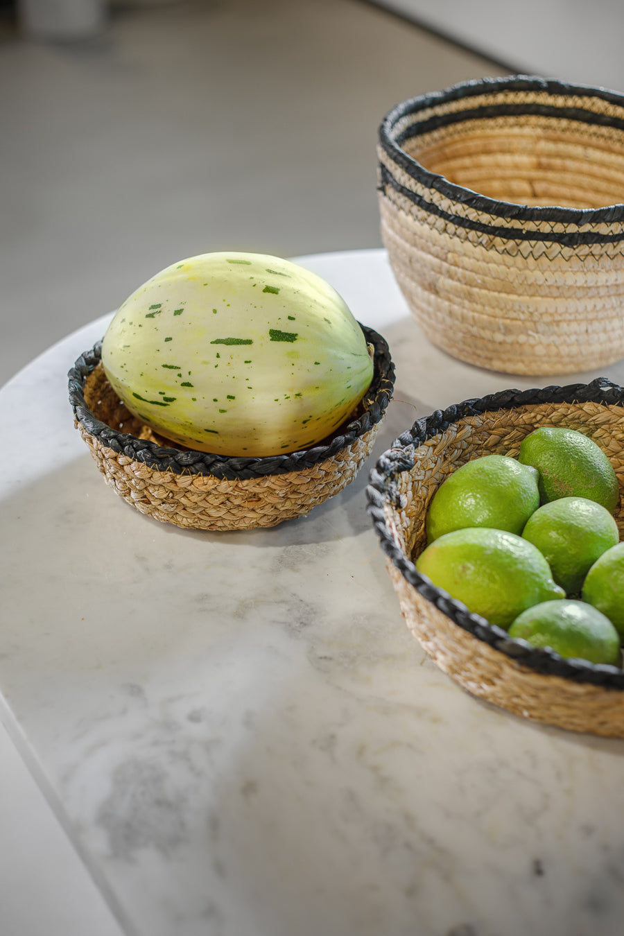 סלסלה ריזורט בגוון טבעי. סלסלת הגשה מעוצבת אריגת חבל צפופה בגימור פס שחור.