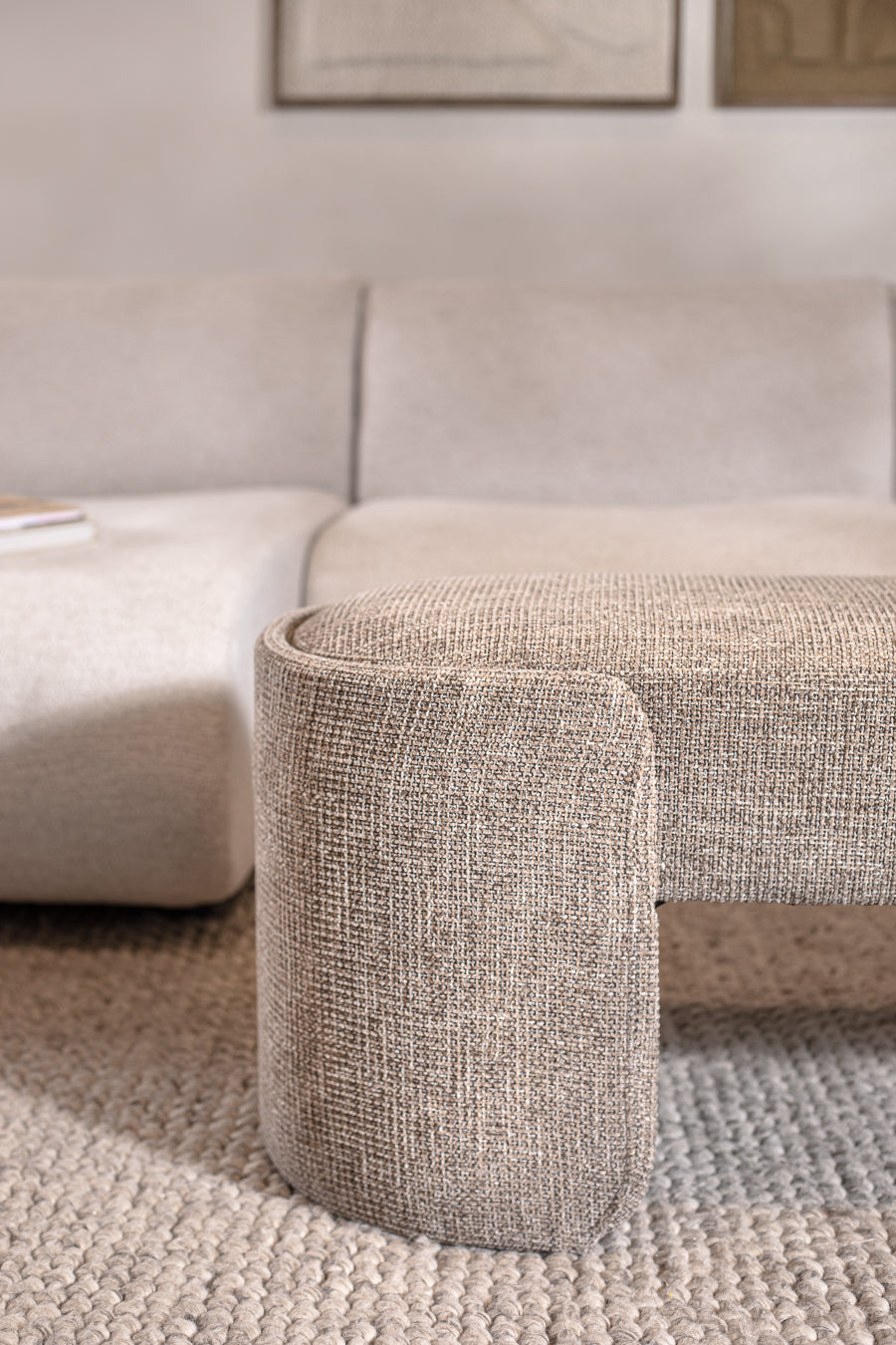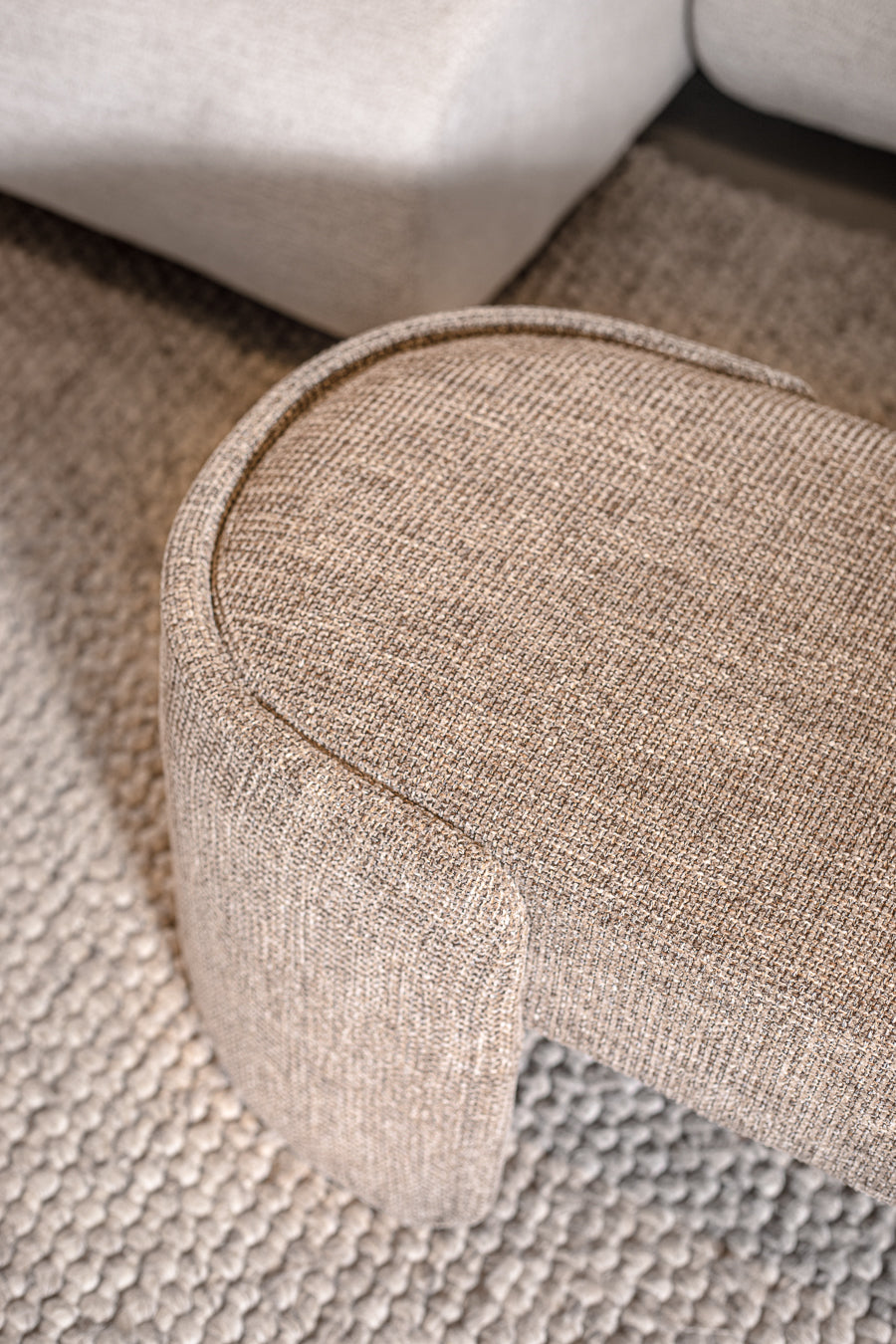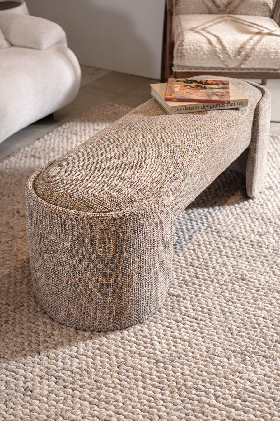 ספסל בגוון חום בהיר. ספסל אירוח אלגנטי בגימור אליפטי-עגול.