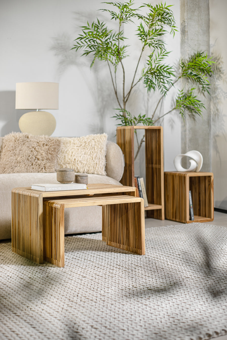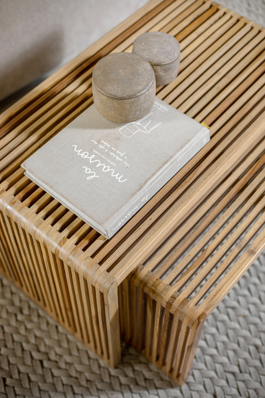 ספסל ריזורט בגוון עץ טיק. ספסל עץ טיק מעוצב פסי עץ מכופפים בגימור שיקי.