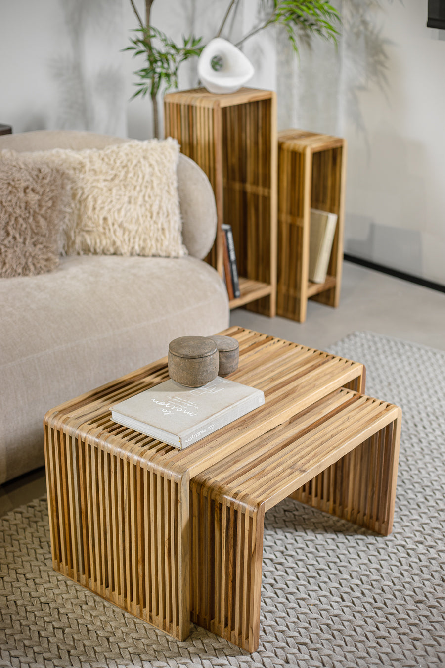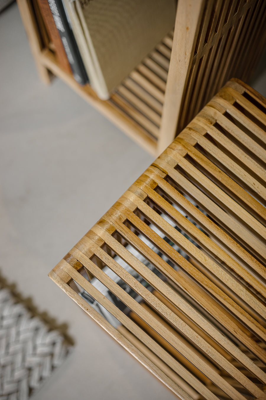 ספסל ריזורט בגוון עץ טיק. ספסל עץ טיק מעוצב פסי עץ מכופפים בגימור שיקי.