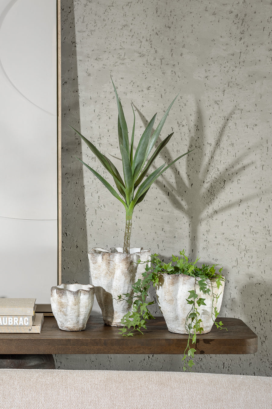 עציץ צמנט טוסקני בגוון אפור. פלנטר בטון רחב מעוצב קימוט ייחודי בחומר.