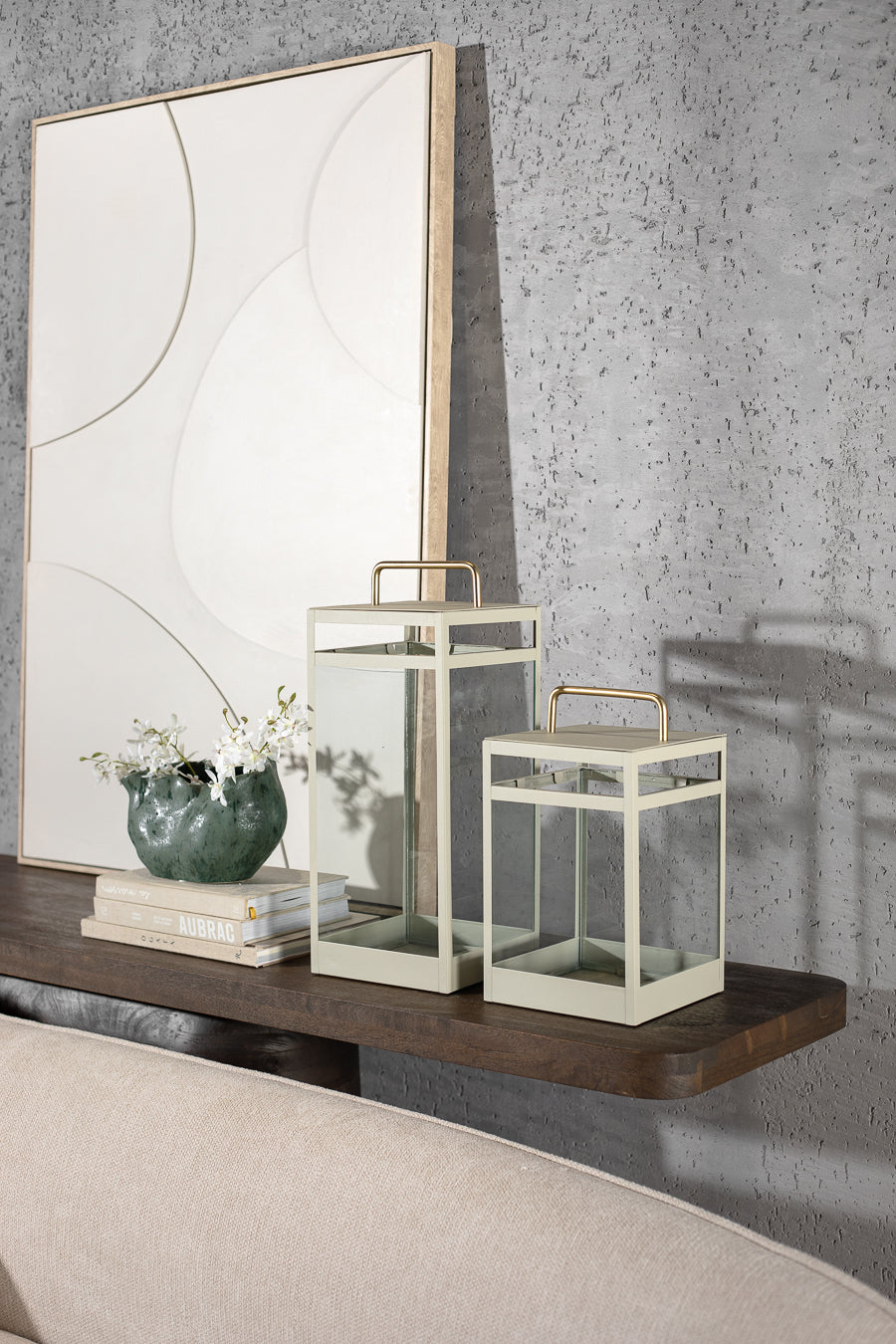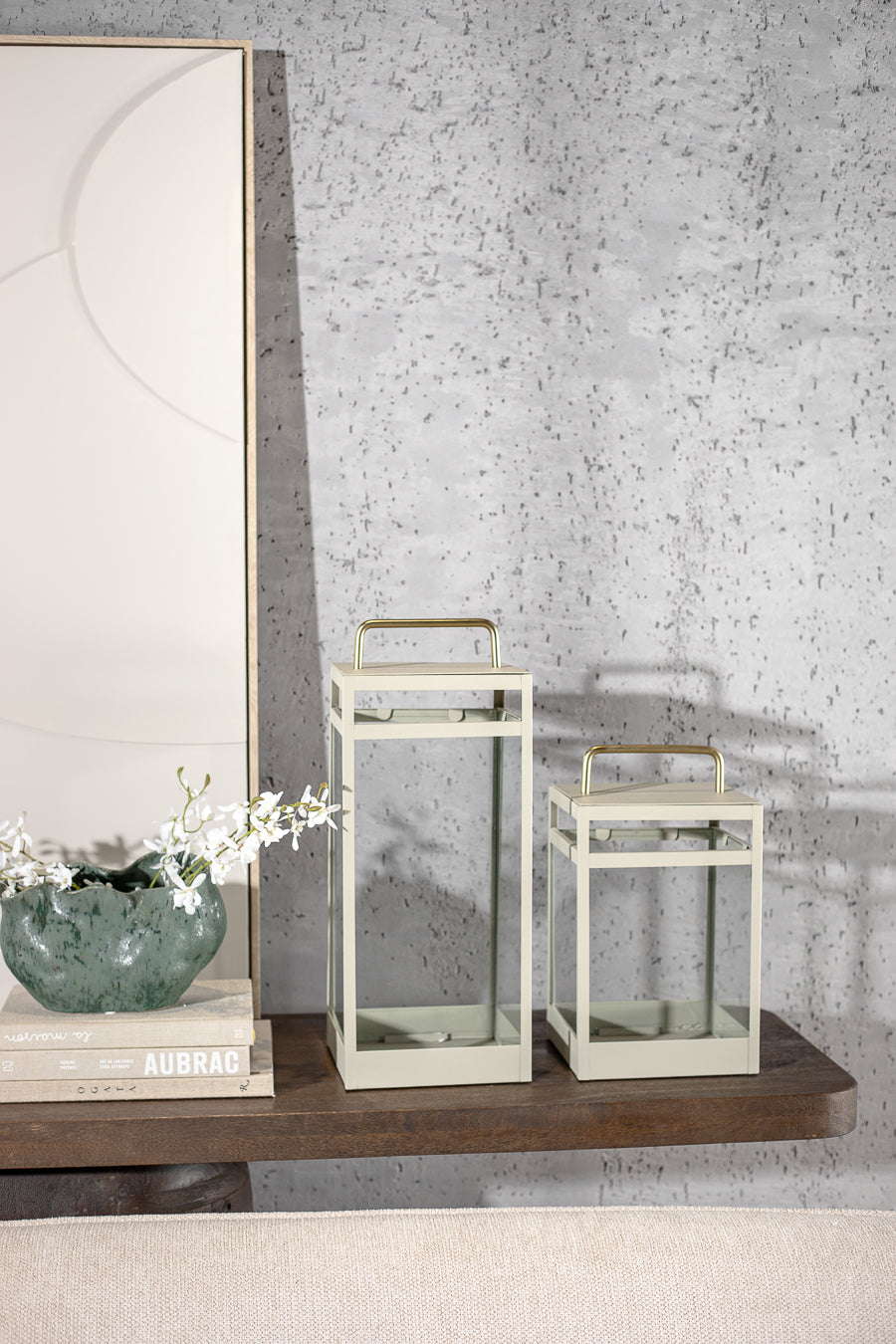 עששית אייקון פרופיל מלבני ממוסגרת מתכת בצבע בז'. עששית מעוצבת חלונות זכוכית שקפה וידית נשיאה. אקססורי קלאסי לאיבזור מעוצב באינטרפטציה עכשווית.