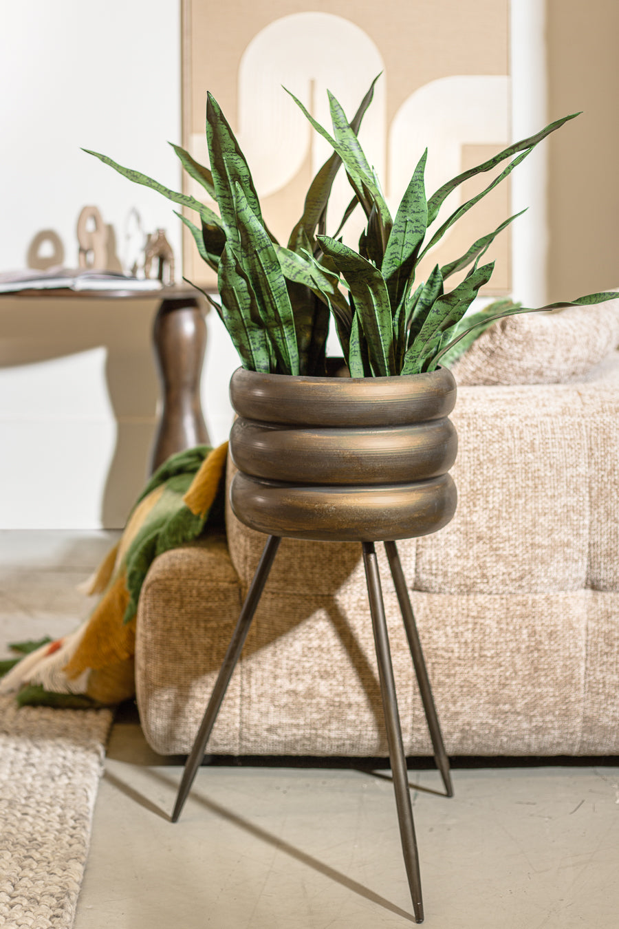 פלנטר בארל ריצפה בצבע ברונזה. בית עציץ המעוצב גוף פסי רוחב עבים הנישא רגלי מתכת.