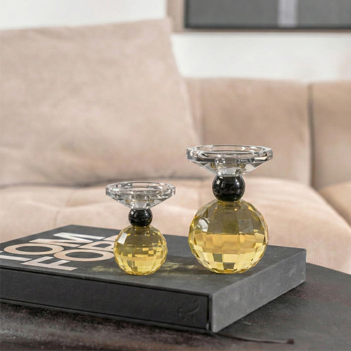 פמוט זכוכית דאיימונד פרופיל גיאומטרי בצבע אמבר. פמוט מעוצב גוף עגול בסיתות יהלום , אלמנט כדורי שחור וכוס אפורה ורודה בגימור עגול.