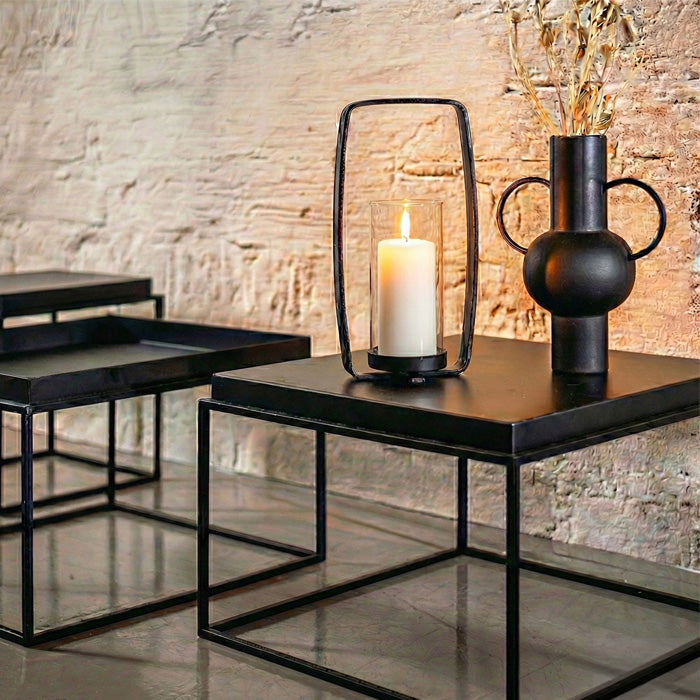 פמוט זכוכית דקו פריים עשוי זכוכית ומיסגור מתכת שחורה. פמוט בעיצוב אינטיליגנטי, העושה שימוש באשליה של מוצר נוכח לבין חסר במרחב.