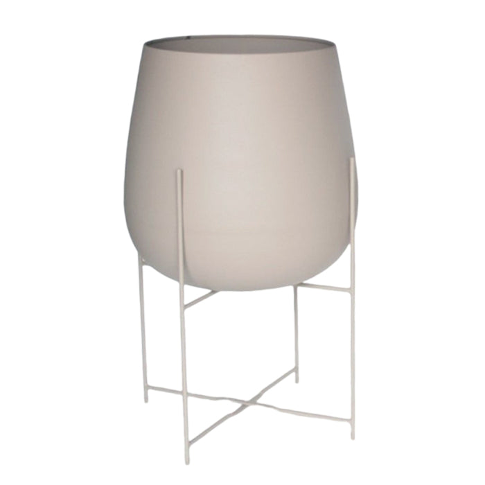 פלנטר מתכת קוזי סטנד עגול בגוון אפרפר. בית עציץ מרשים בעיצוב מנימליסטי הניצב על רגלי מתכת בגוון זהה.