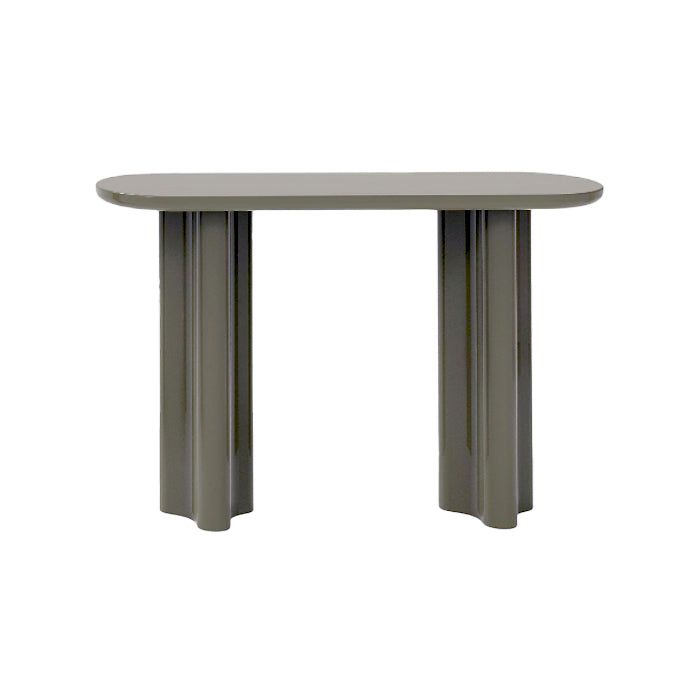 קונסולה גלוסי אובלית בגוון ירוק. שולחן המעוצב פלטה מעוגלת, הניצבת על בסיס 2 רגליים פיסוליות בקו רך .