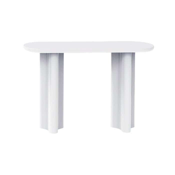 קונסולה גלוסי אובלית בצבע לבן. שולחן המעוצב פלטה מעוגלת, הניצבת על בסיס 2 רגליים פיסוליות בקו רך .