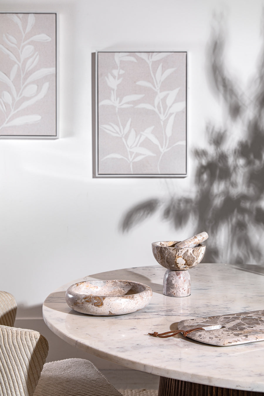 קערת שיש צ'וקלאט עגולה בצבע בז'. כלי הגשה נוכח בגימור חלק ונוכחות בחומר.