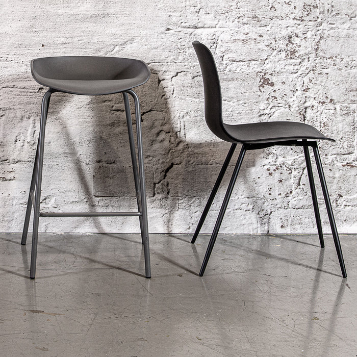 כיסא בר רינו בצבע אפור. כיסא גבוה מעוצב one piece קולור בלוק העומד על רגלי מתכת בצבע זהה .