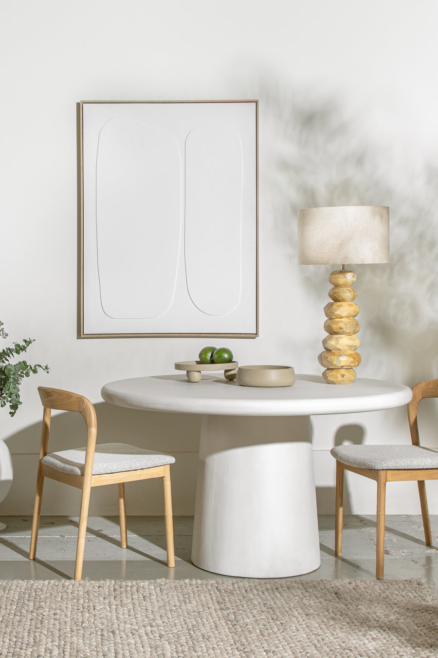 שולחן אוכל ספייס עגול בצבע אייבורי. שולחן המעוצב פלטה עגולה, הניצבת על עמוד בגימור אבן גיר.