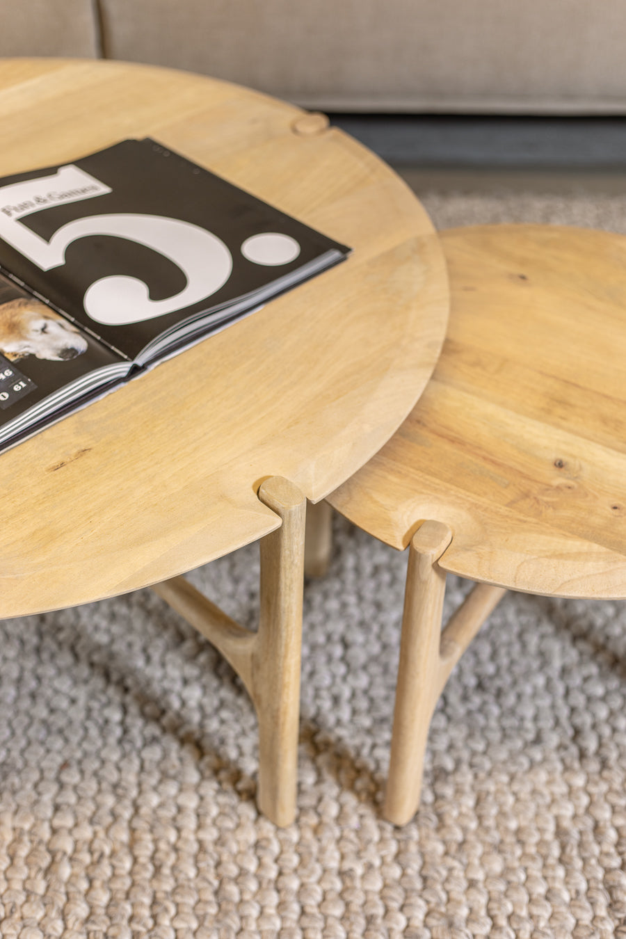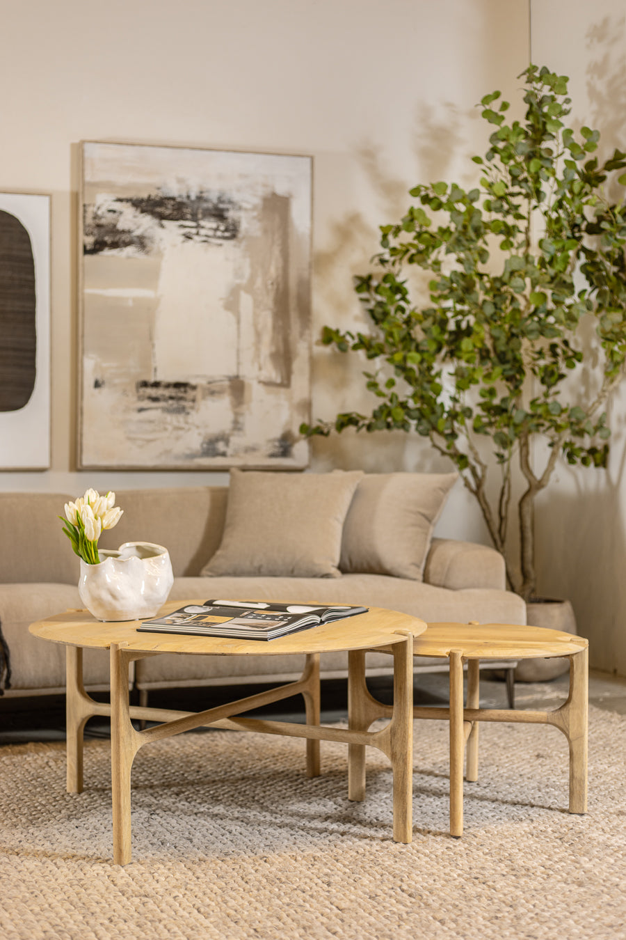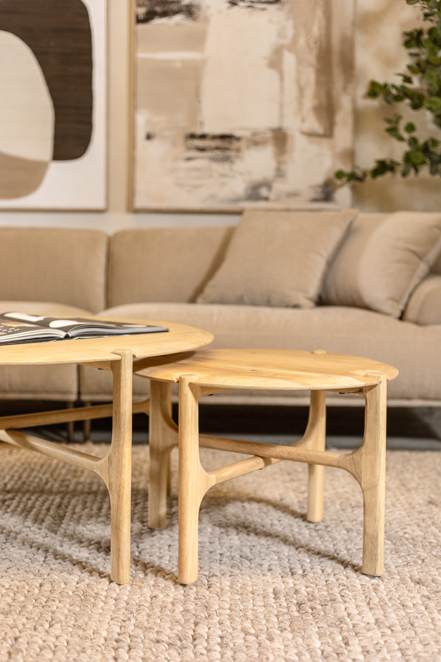 שולחן קפה בגוון עץ טבעי. שולחן מעוצב פלטת עץ עגולה הנישאת בסיס רגלי עץ מוצלב.