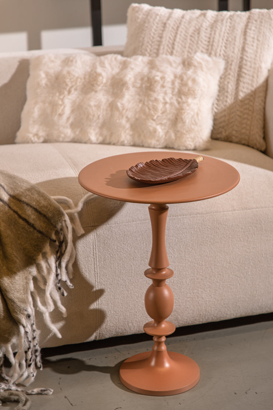 שולחן צד אסקייפ בגוון חום ארגמן. שולחן המורכב מפלטה עגולה שטוחה הנישאת על רגל מעוצבת ברוחב משתנה .