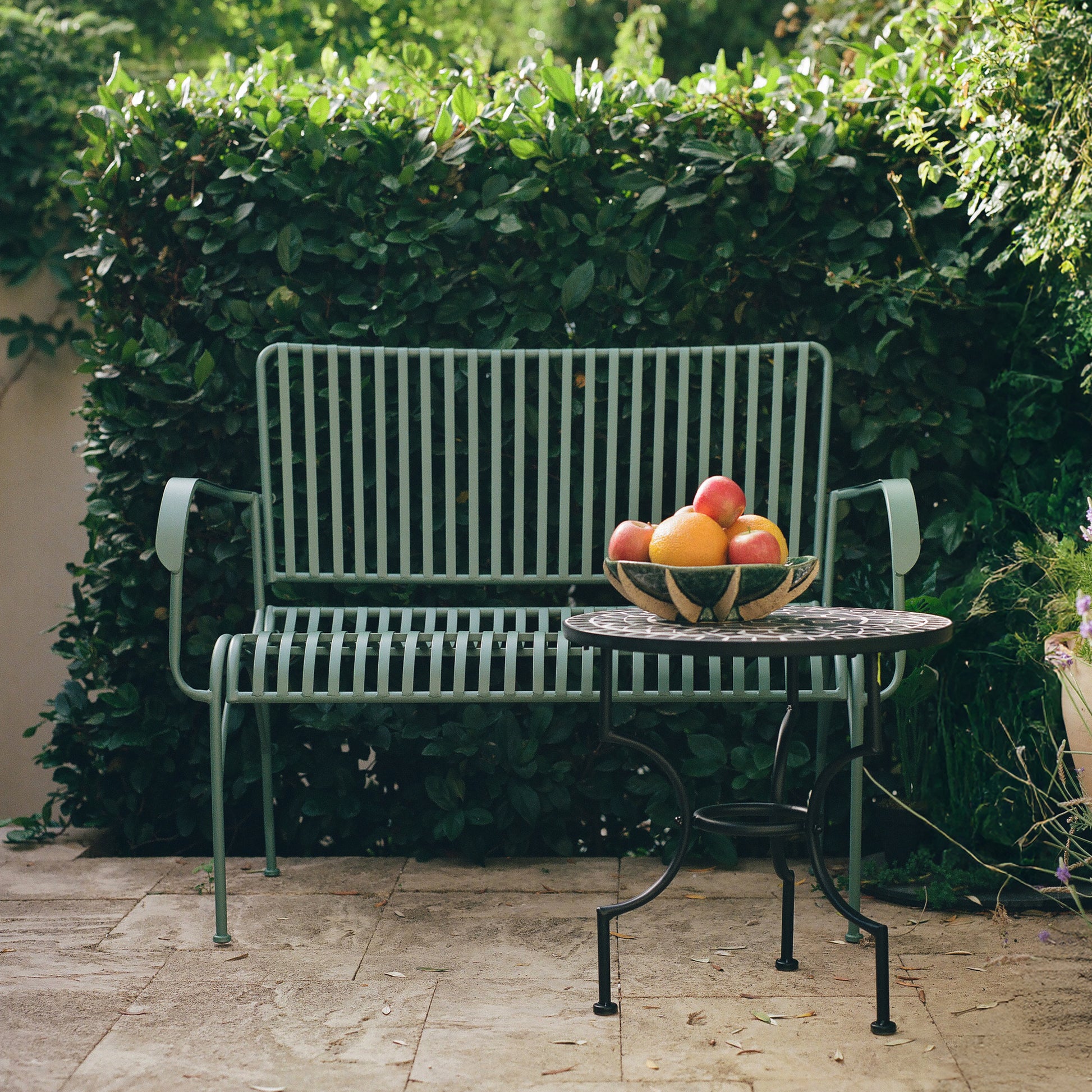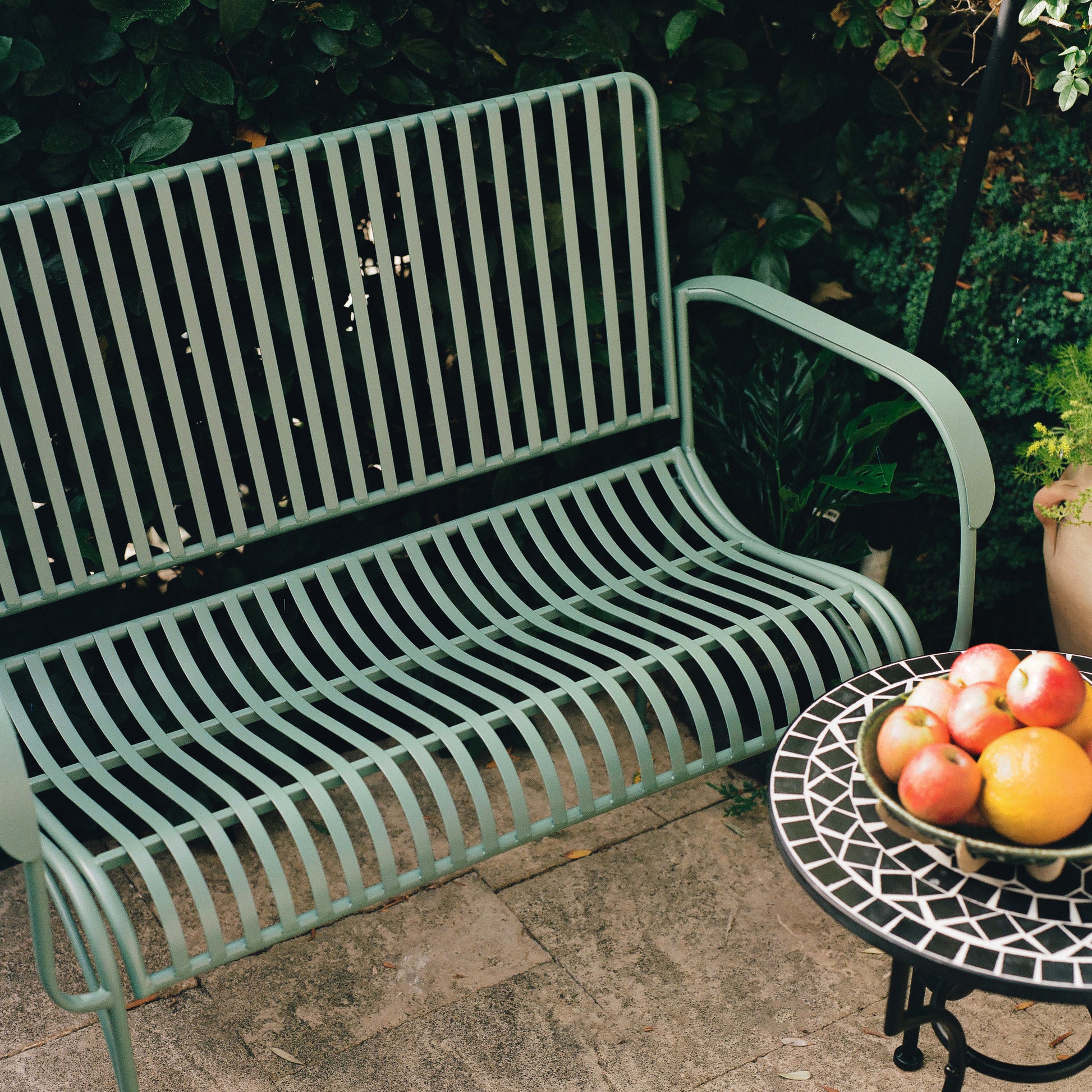שולחן גן אגאדיר משובץ מוזאיקה שחורה. שולחן פסיפס הניצב על רגליי מתכת שחורות בסגנון פיוטי. שולחנות הפסיפס המרוקאי מתאימים לשימוש פנים וחוץ.