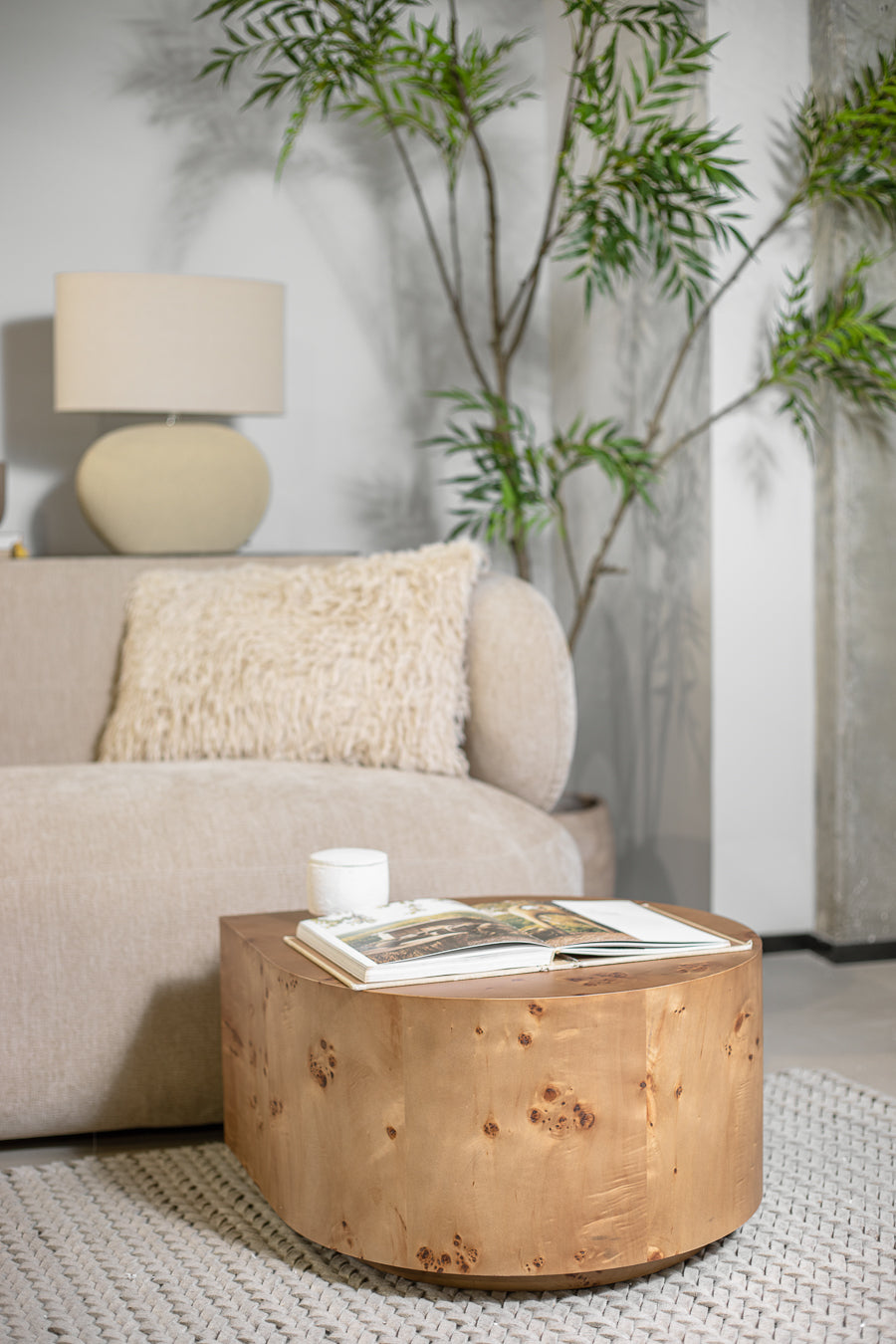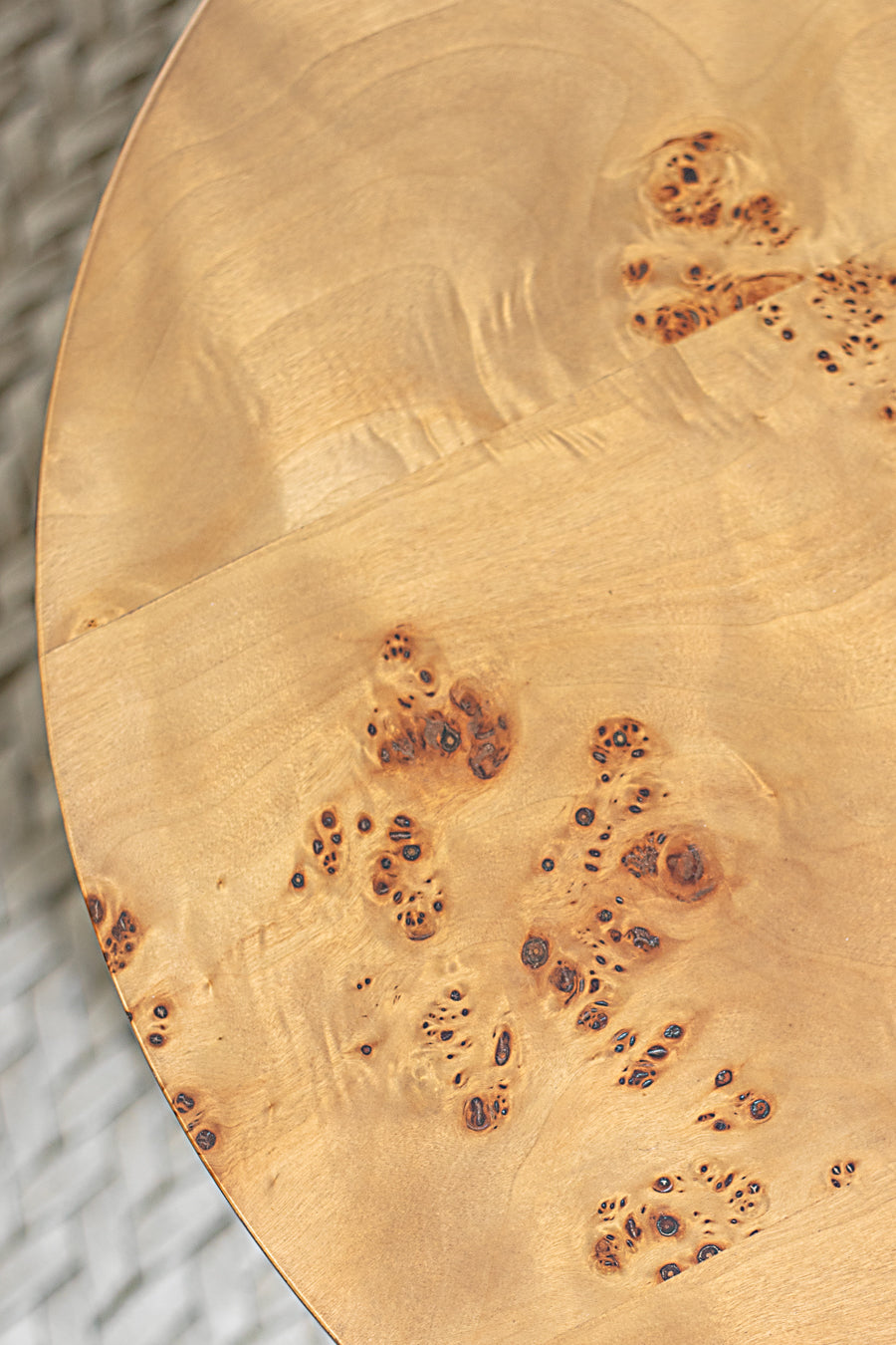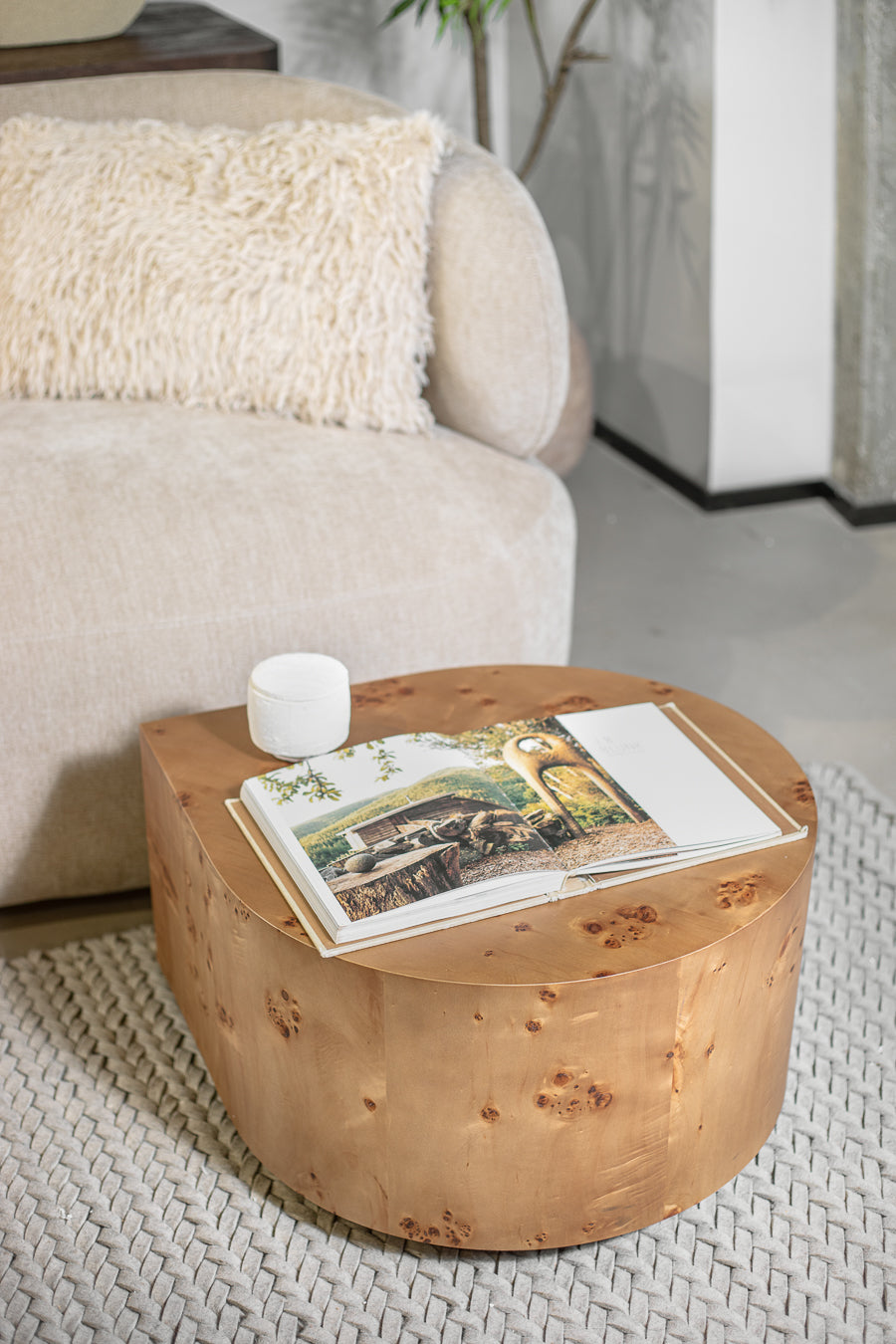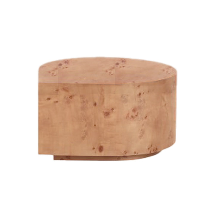 שולחן טיפה לומינה בגוון עץ טבעי. שולחן סלון מעוצב עץ בדיגום "עיניים" הנישא על בסיס נמוך.