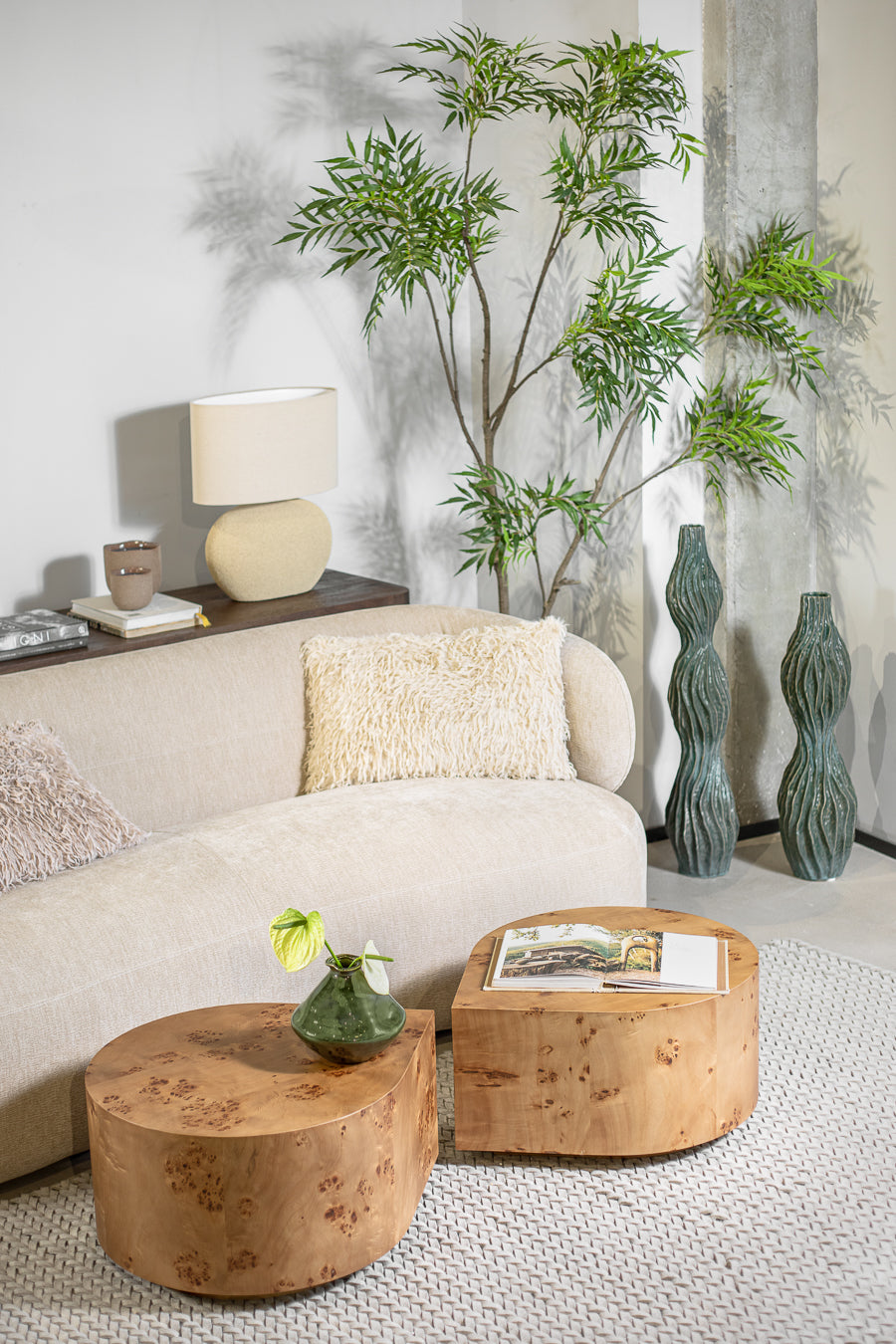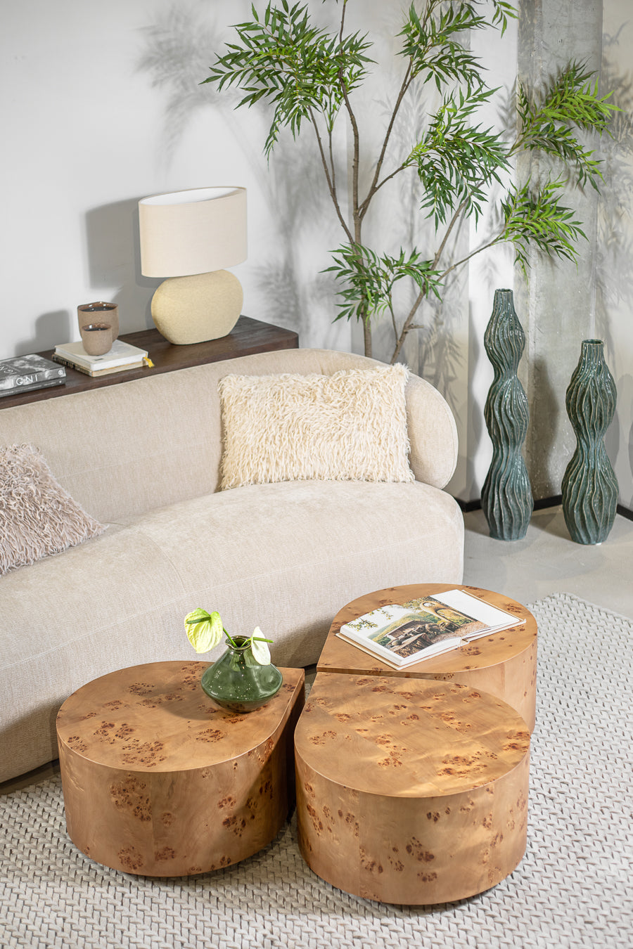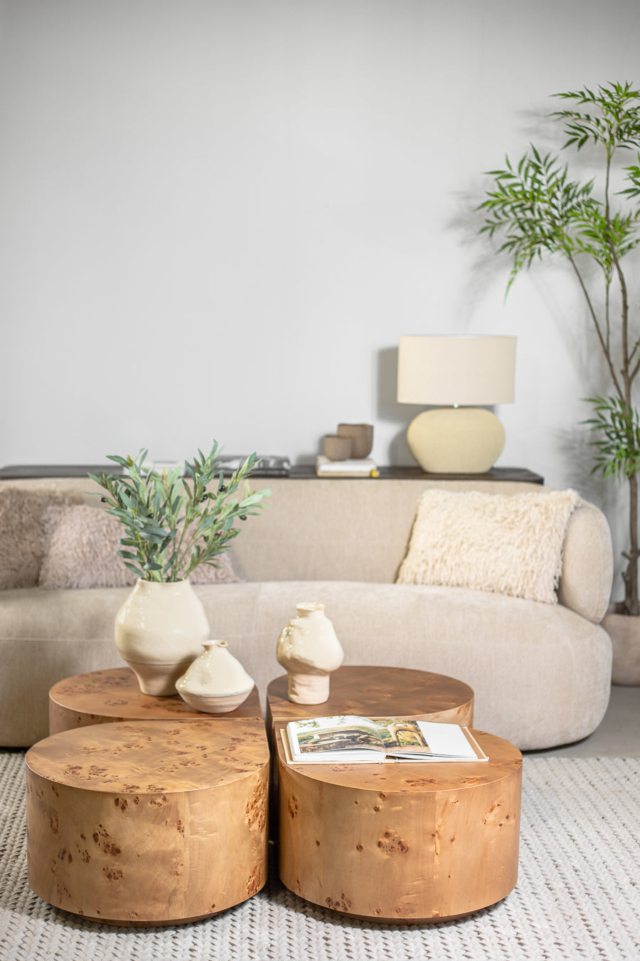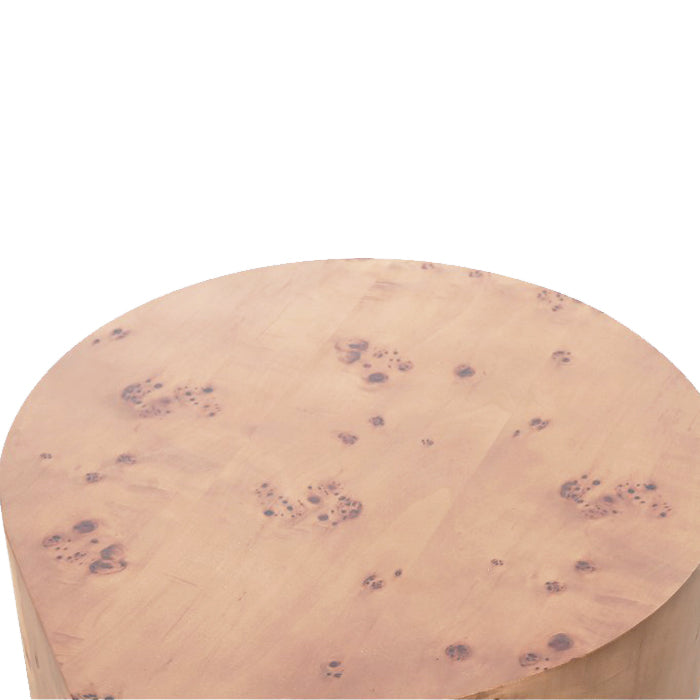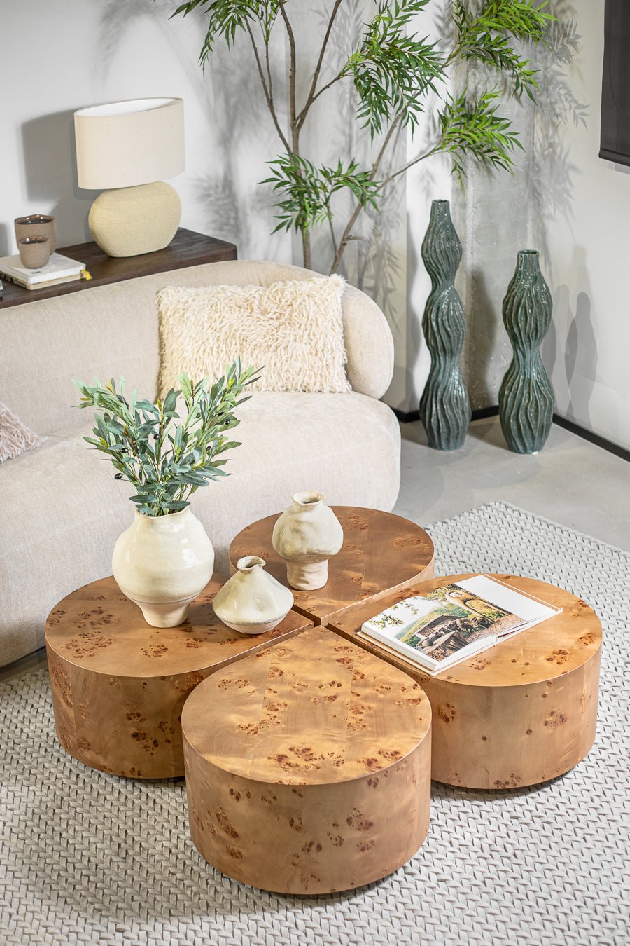 שולחן טיפה לומינה בגוון עץ טבעי. שולחן סלון מעוצב עץ בדיגום "עיניים" הנישא על בסיס נמוך.