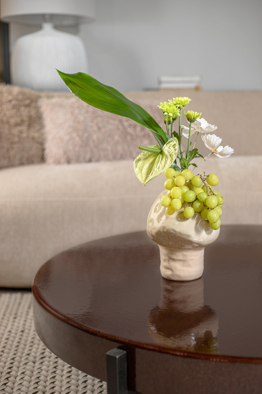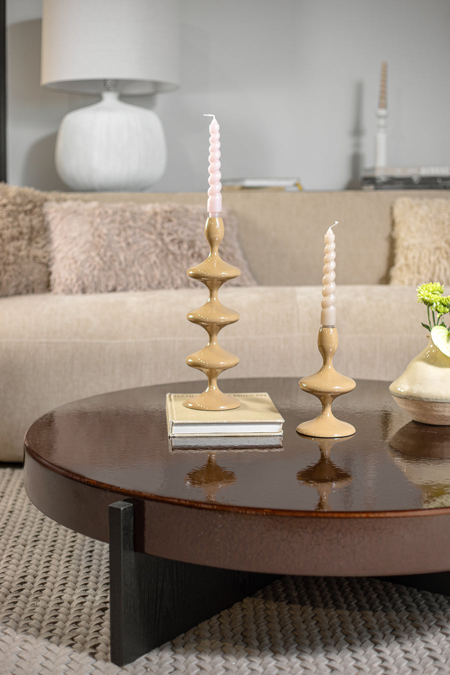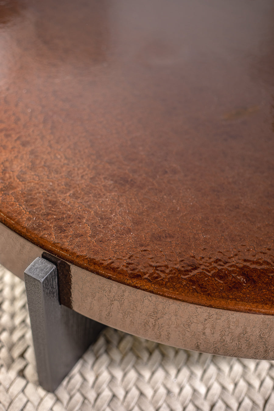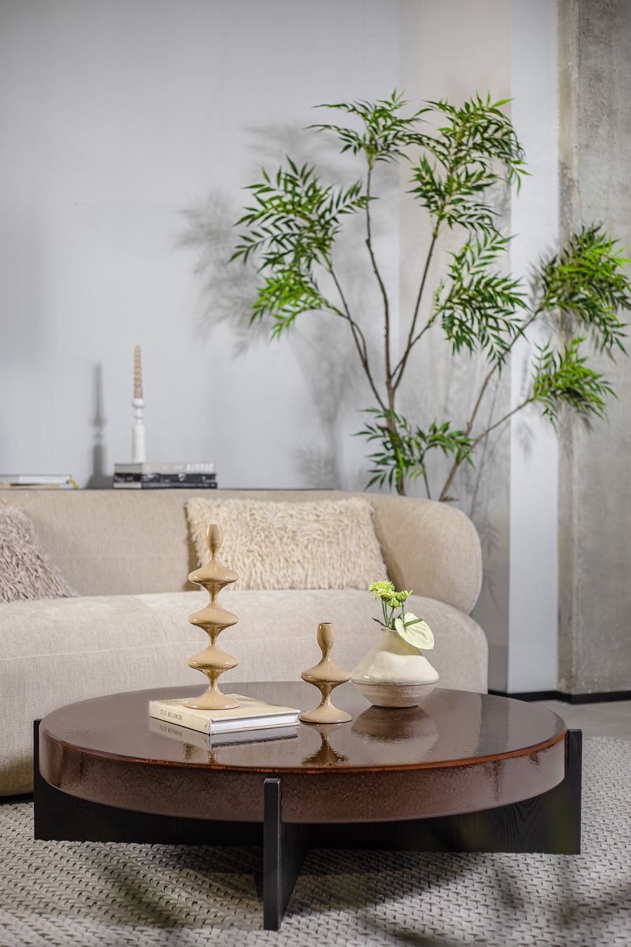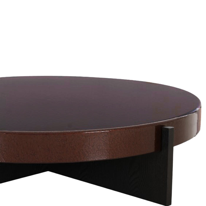 שולחן לומינה בגוון חום אדמדם. שולחן סלון מרשים, מעוצב פלטה עגולה, הניצבת על רגלי מתכת בגוון שחור.
