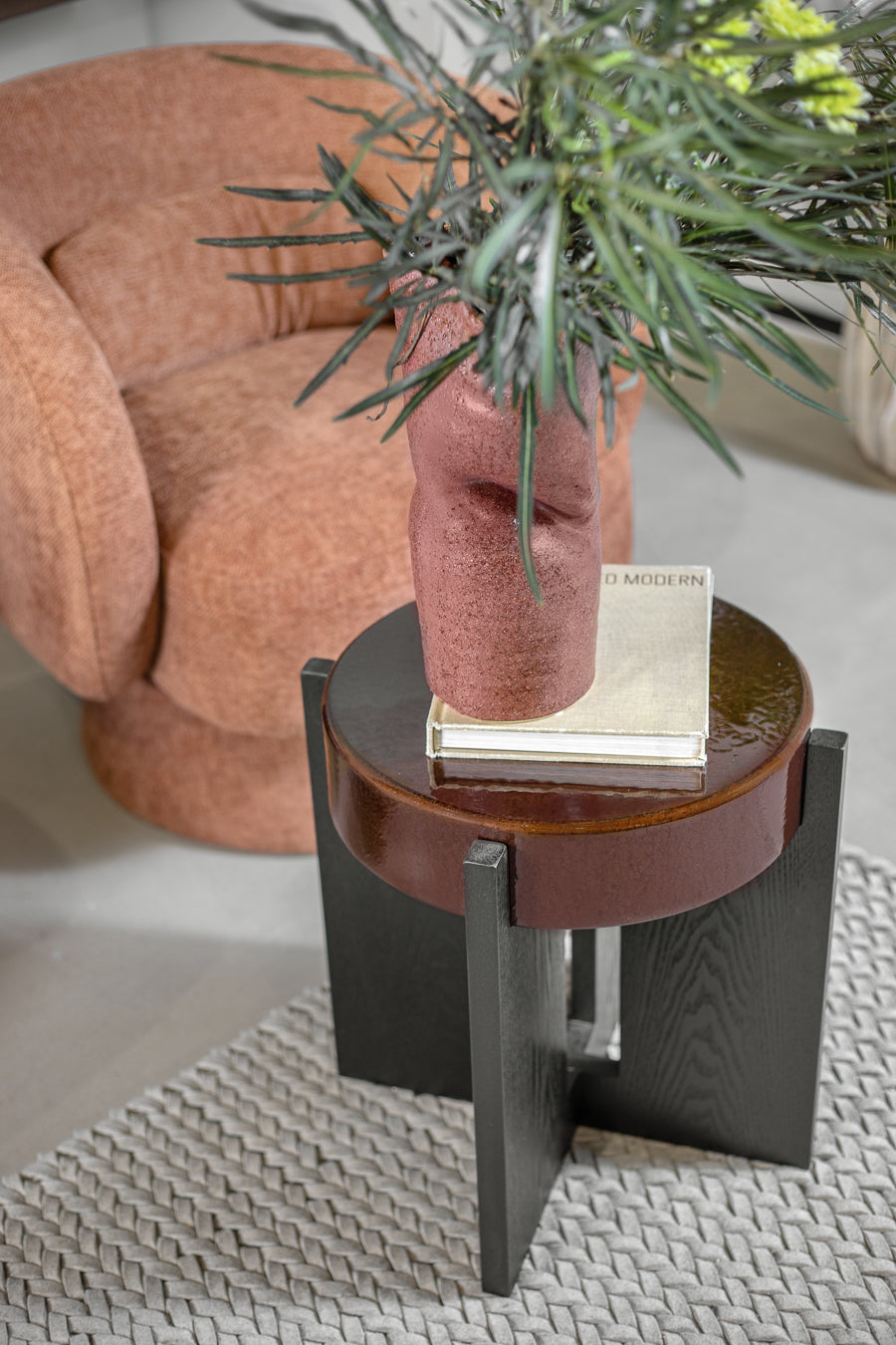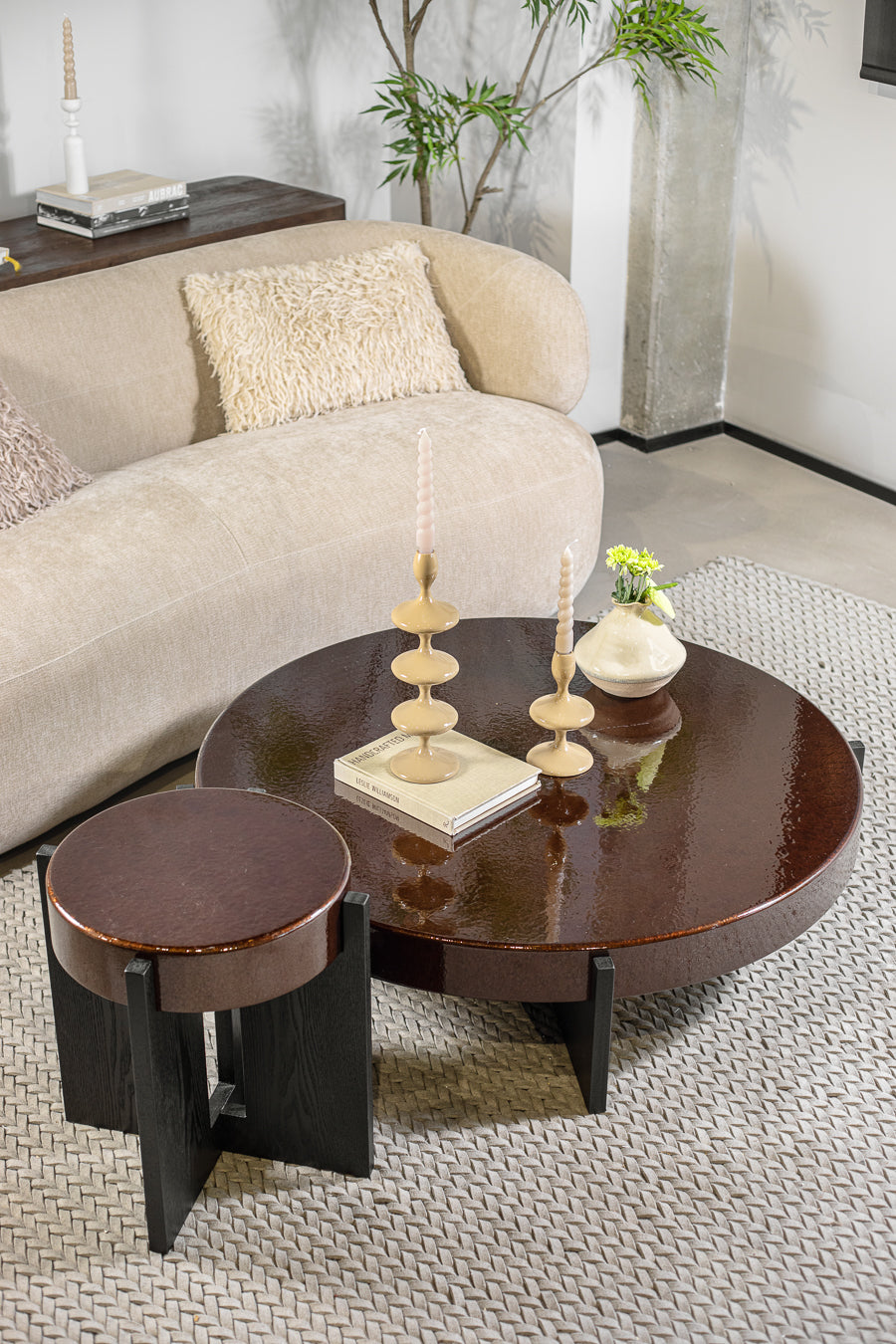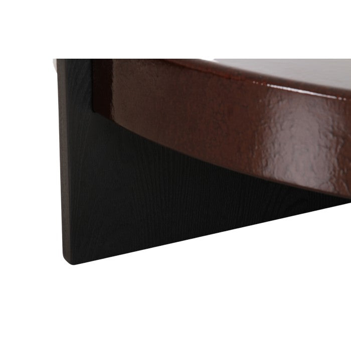 שולחן לומינה בגוון חום עמוק. שולחן צד מרשיםי, מעוצב פלטה עגולה, הניצבת על רגלי מתכת בגוון שחור.