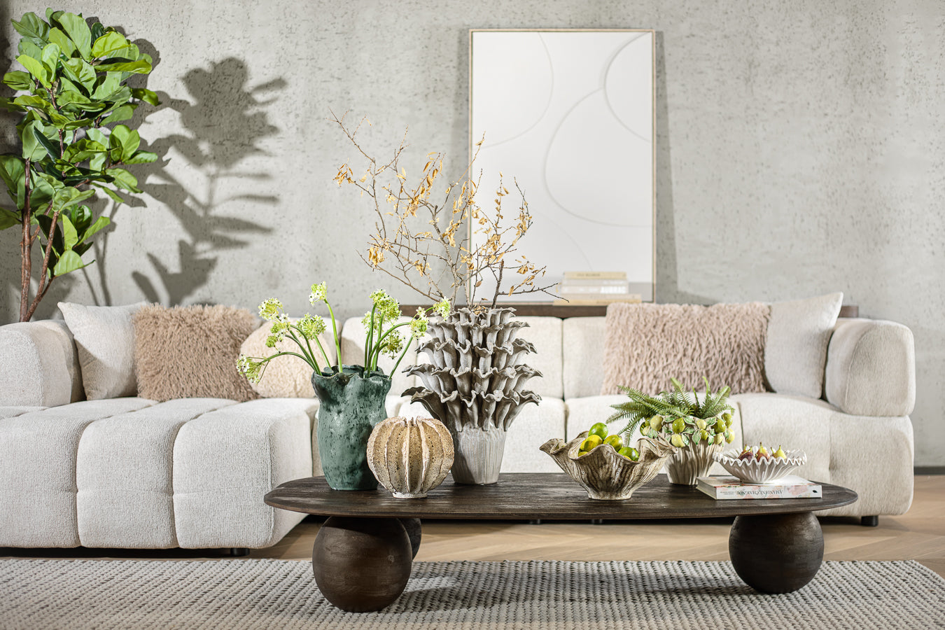שולחן סוהו אובאל בגוון עץ כהה. שולחן סלון מעוצב פלטה אובלית עבה הנישאת על שלושה כדורי עץ עגול בקו אותנטי.