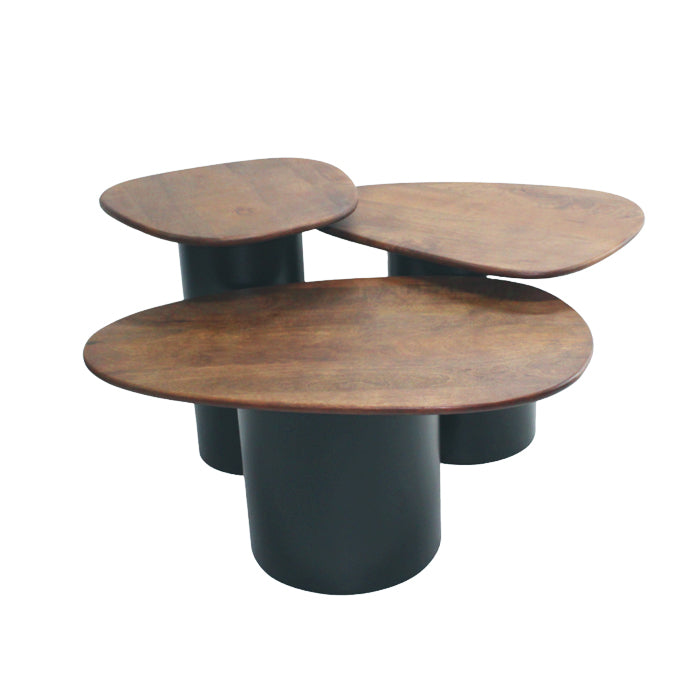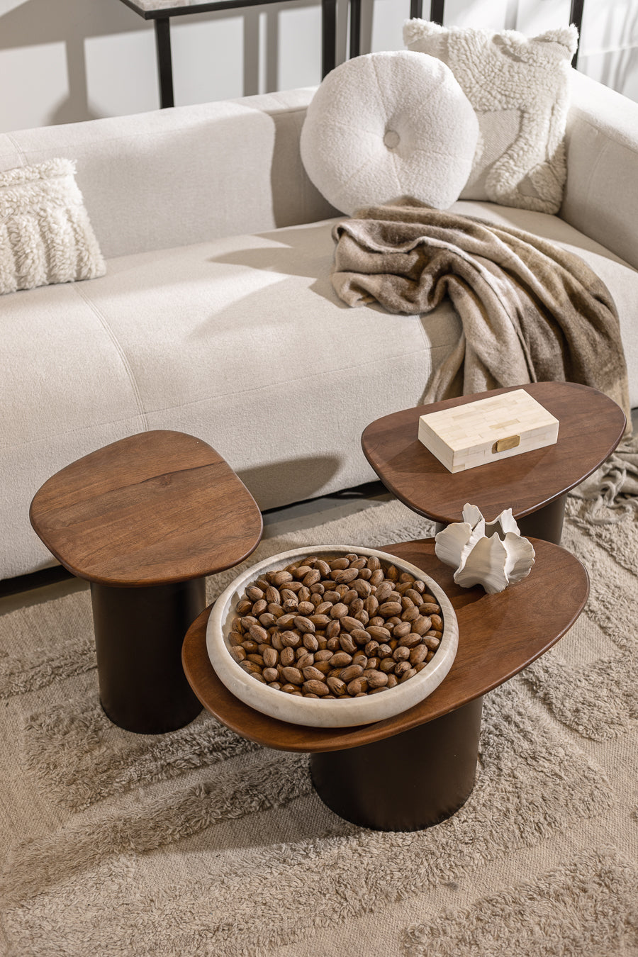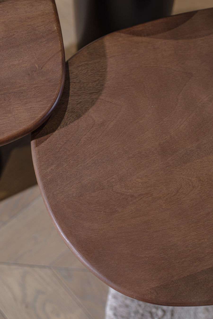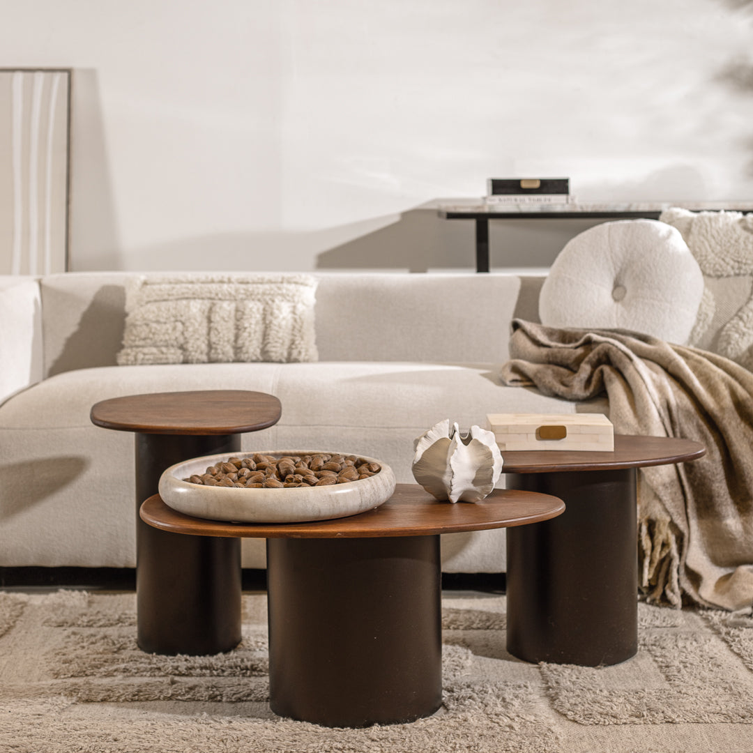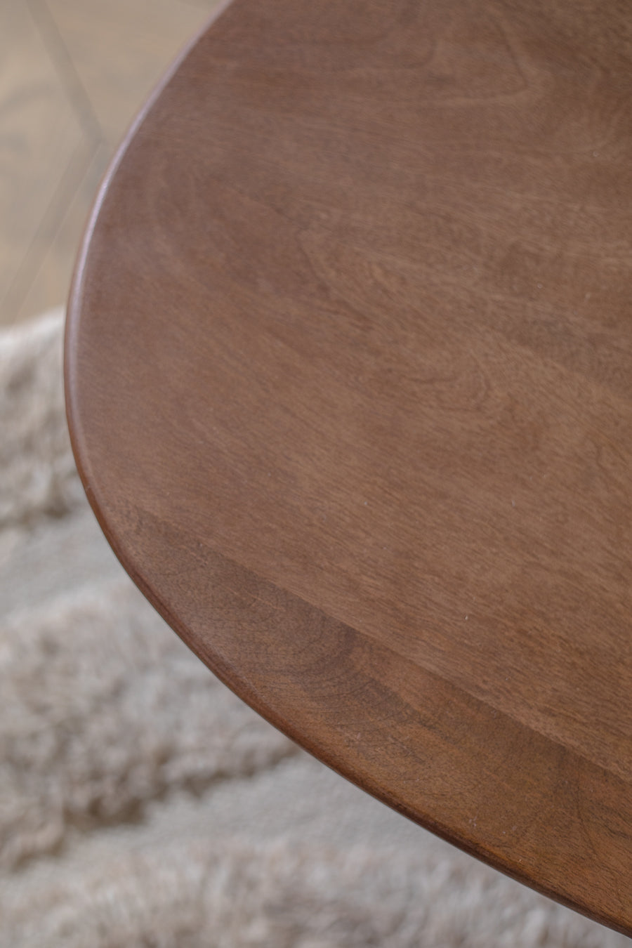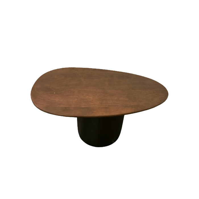 שולחן ספין אורגניק וולנאט בצבע חום. שולחן סלון המעוצב פלטת עץ מנגו אובאלית הנישאת על רגל מתכת עבה.