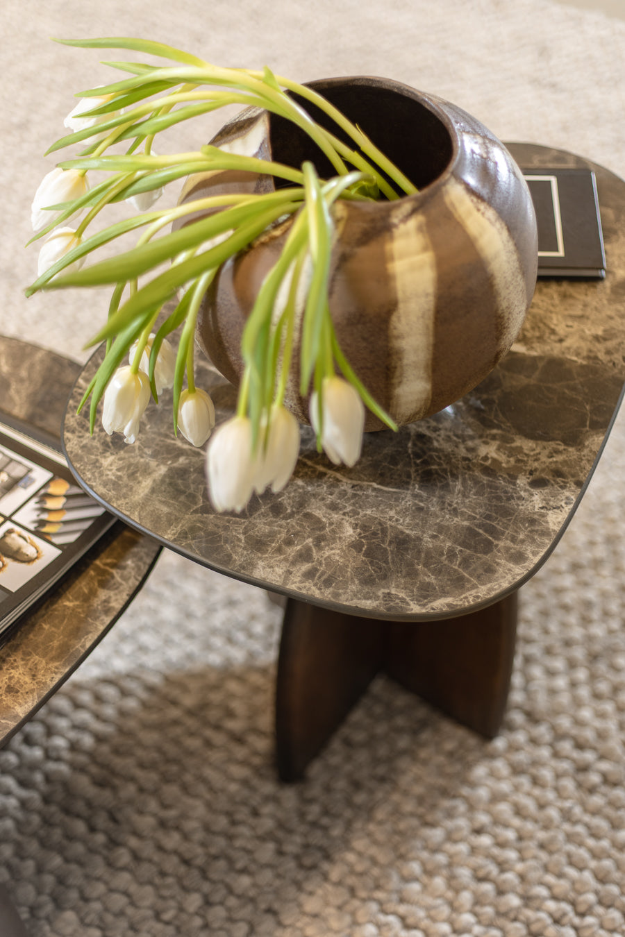 שולחן ספין סטון בגוון מעושן. שולחן סלון המעוצב פלטה בניראות שיש אמורפית, הנישאת על רגל עץ מוצלבת.