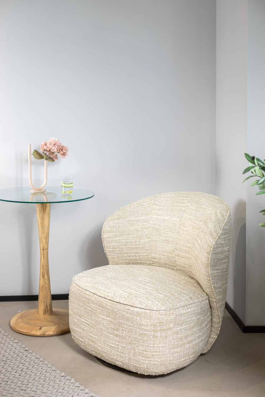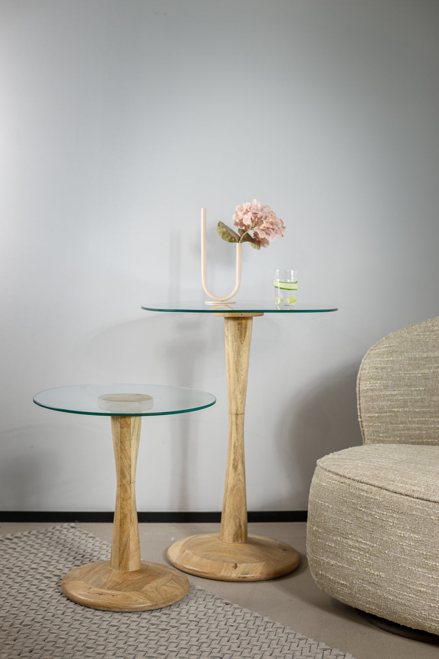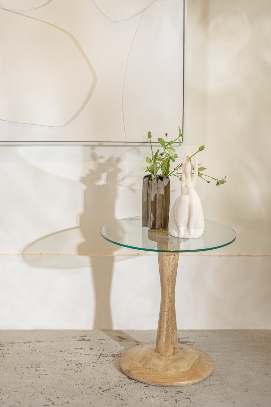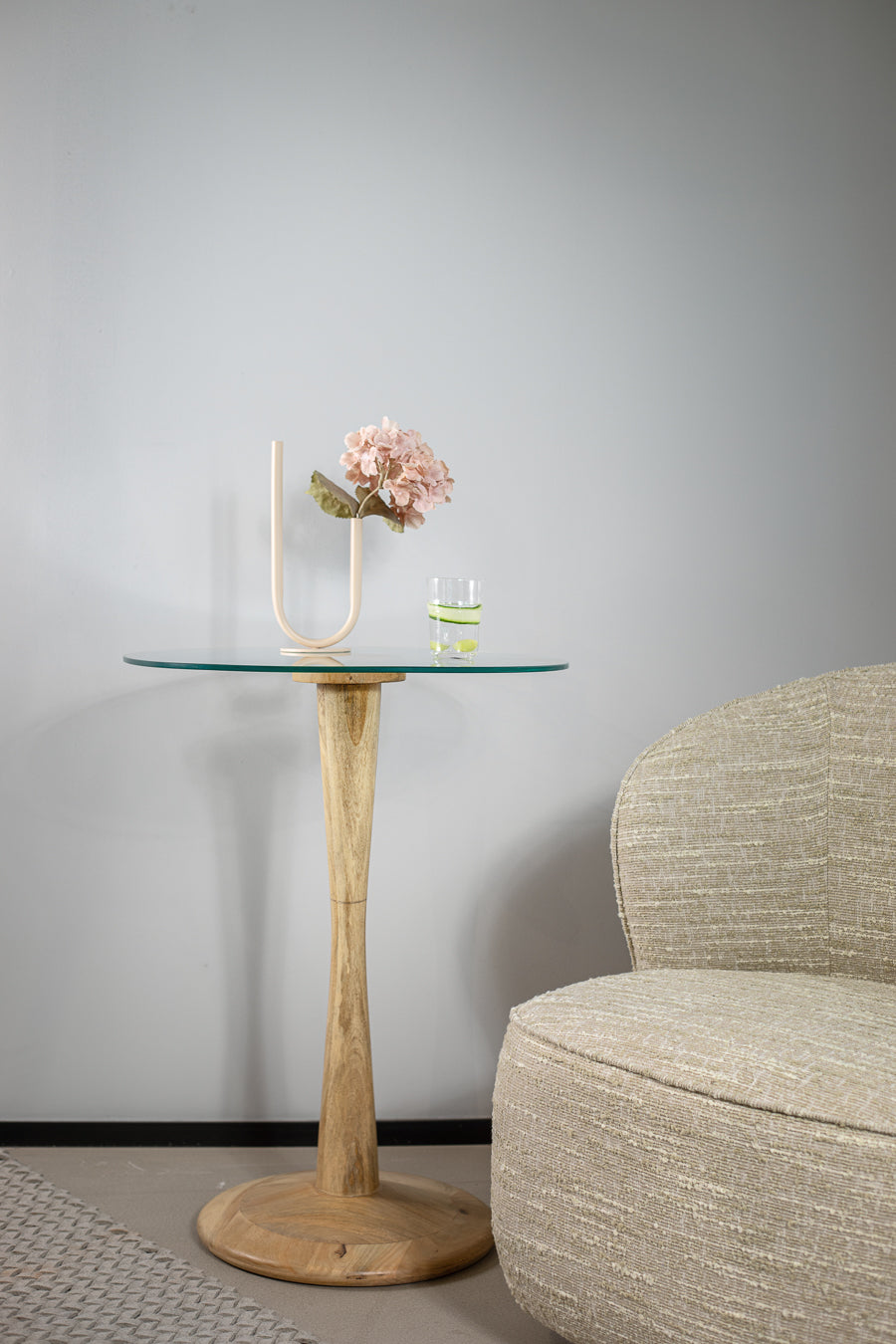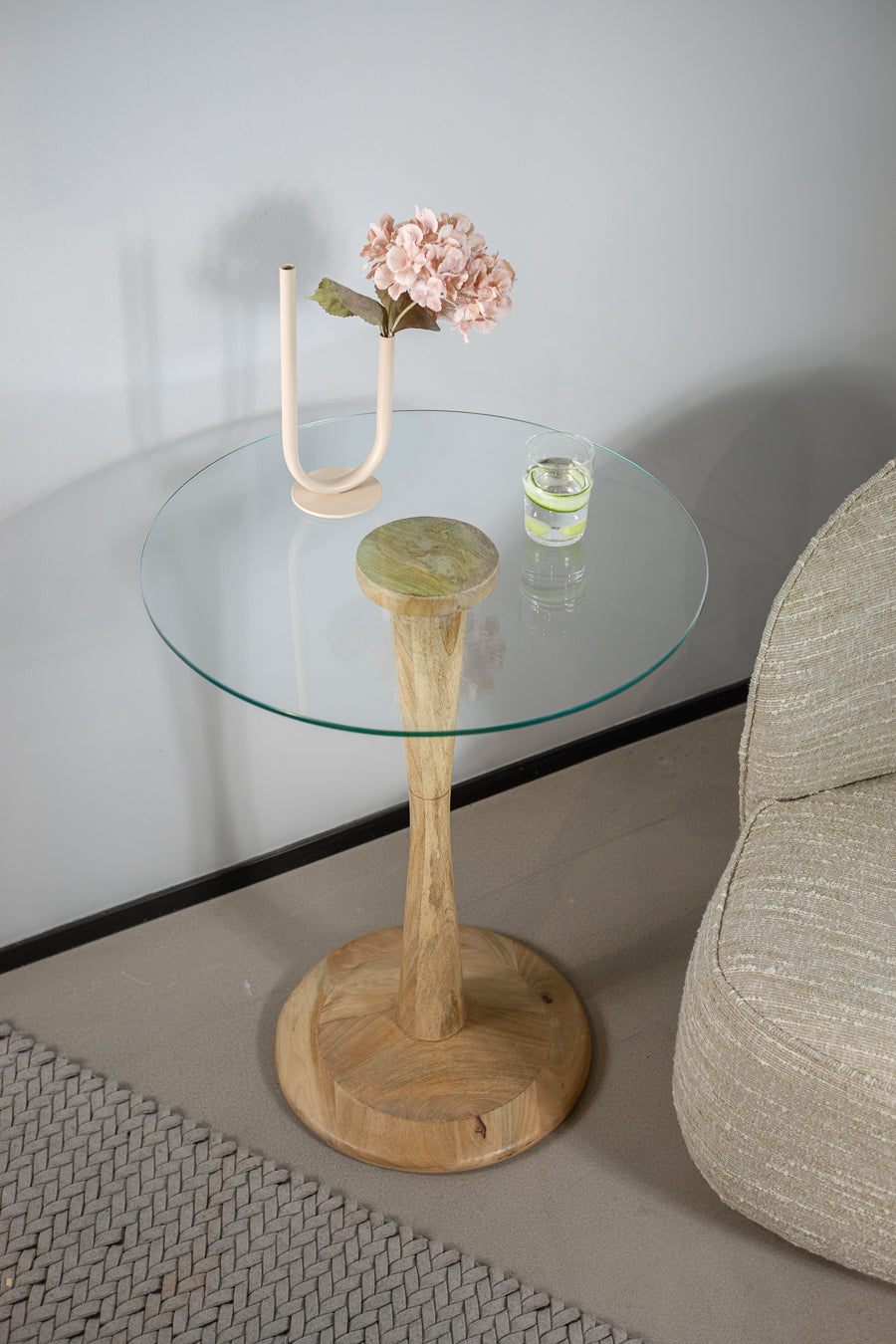 שולחן צד ספקטרה בצבע שחור. שולחן אירוח המורכב פלטת זכוכית עגולה, הנישאת על רגל עץ מסובבת ובסיס עגול.