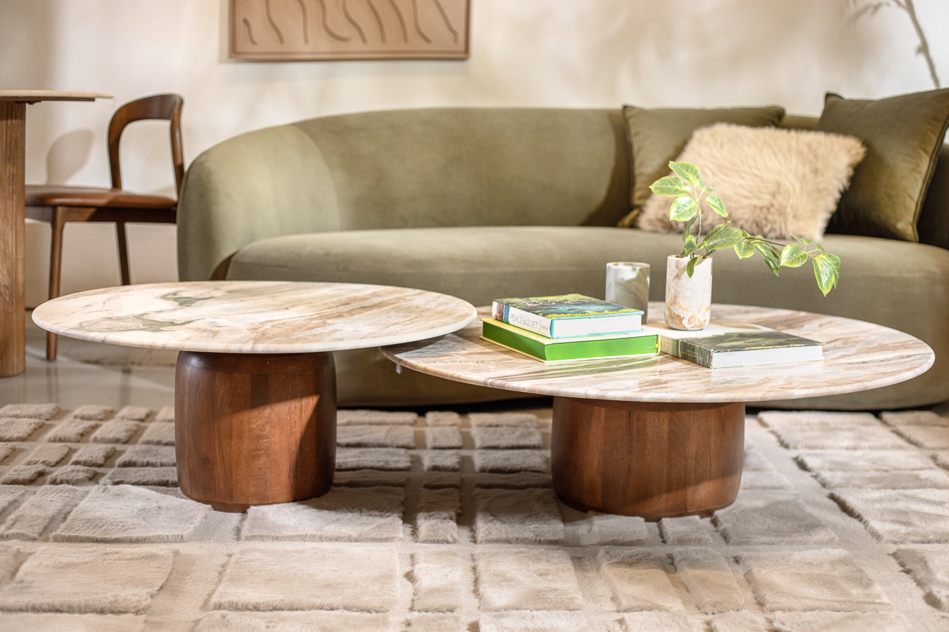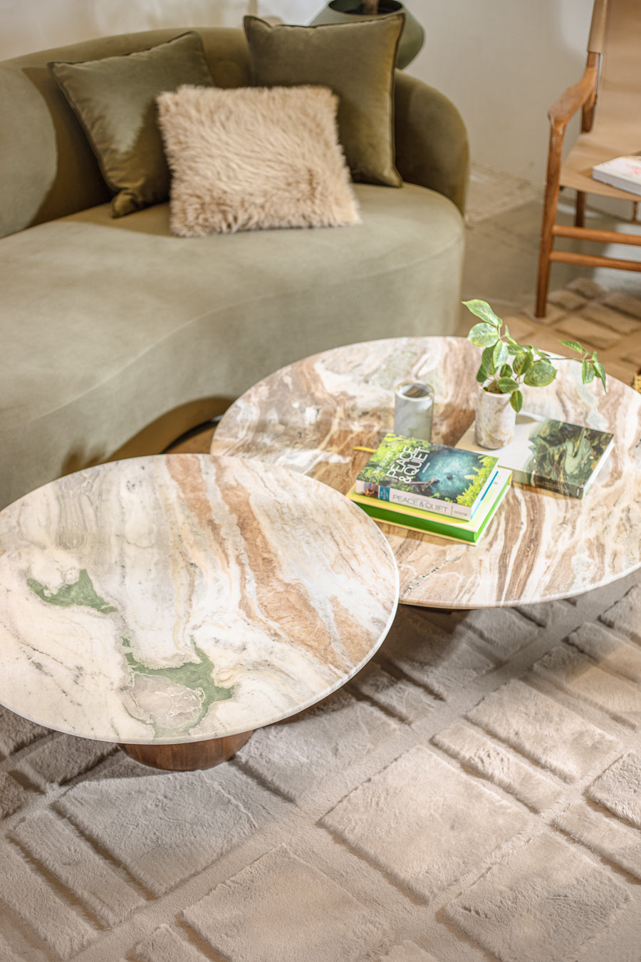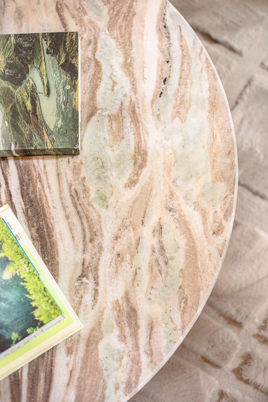 שולחן קוזי מארבל בדפוס מחצב בהיר. שולחן סלון, מעוצב פלטה עגולה הניצבת על רגל עץ עבה.