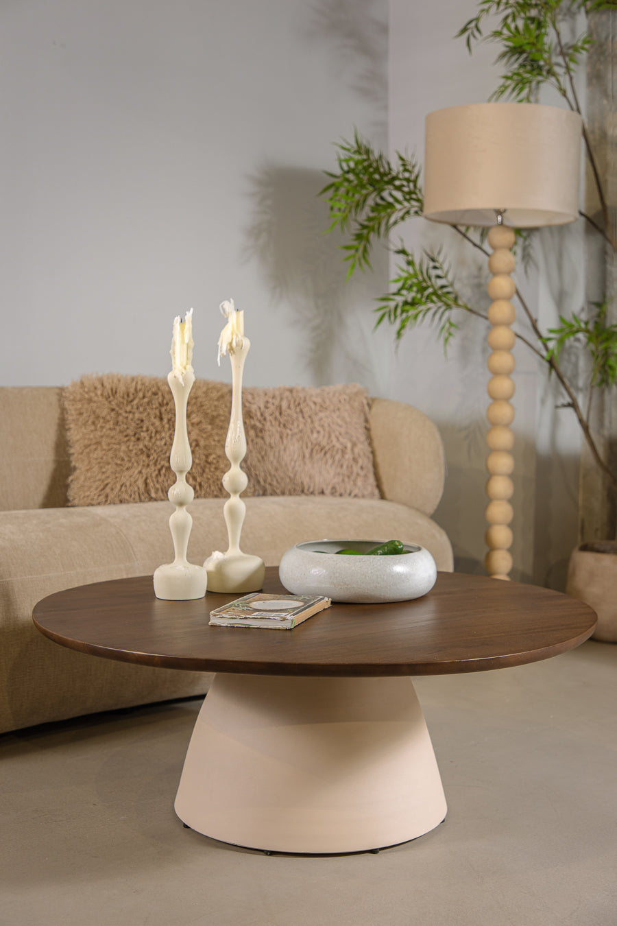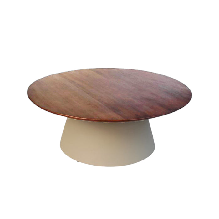 שולחן קוסמוס ראונד אייבורי בראון. שולחן סלון המעוצב פלטת עץ עגולה הנישאת על רגל מתכת זוויתית.