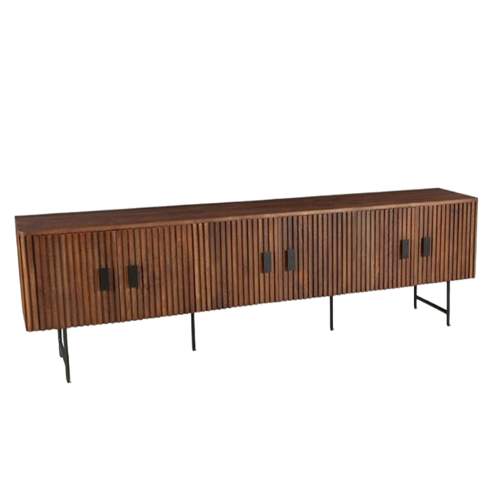 שידת מדיה מרגו בגוון חום כהה. שידת עץ מנגו, מחולקת ל3 יחידות איחסון הנסגרות בדלתות בדיגום פסי עץ ייחודי.