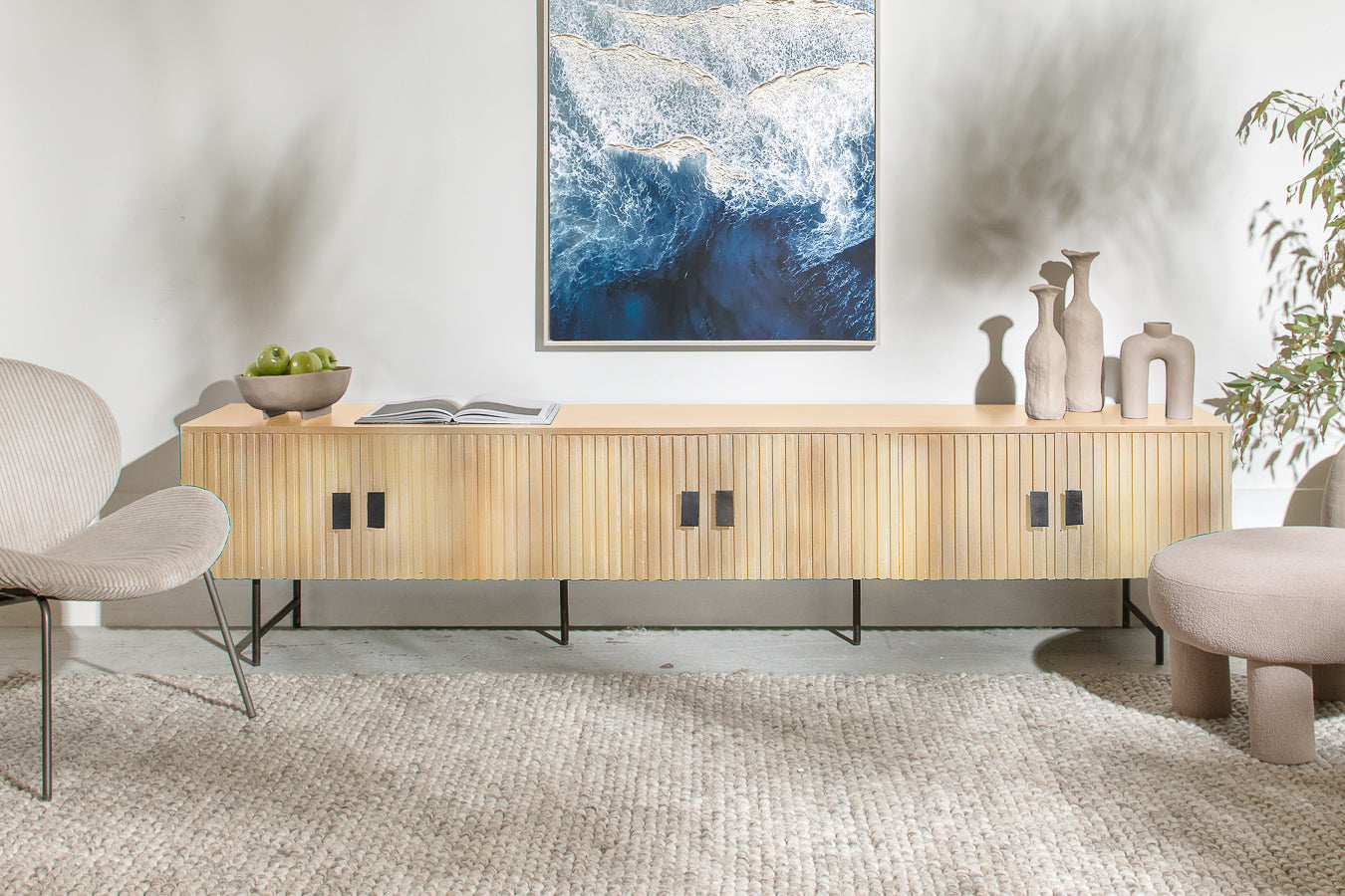 שידת מדיה מרגו בגוון עץ נטורל. שידת עץ מנגו, מחולקת ל 3 יחידות איחסון הנסגרות בדלתות בדיגום פסי עץ ייחודי.
