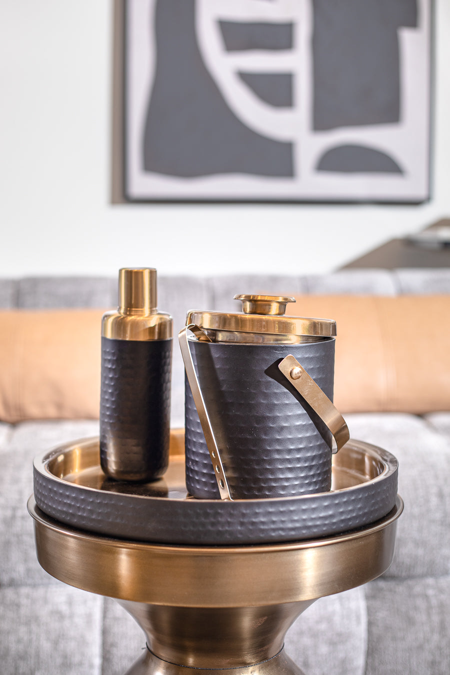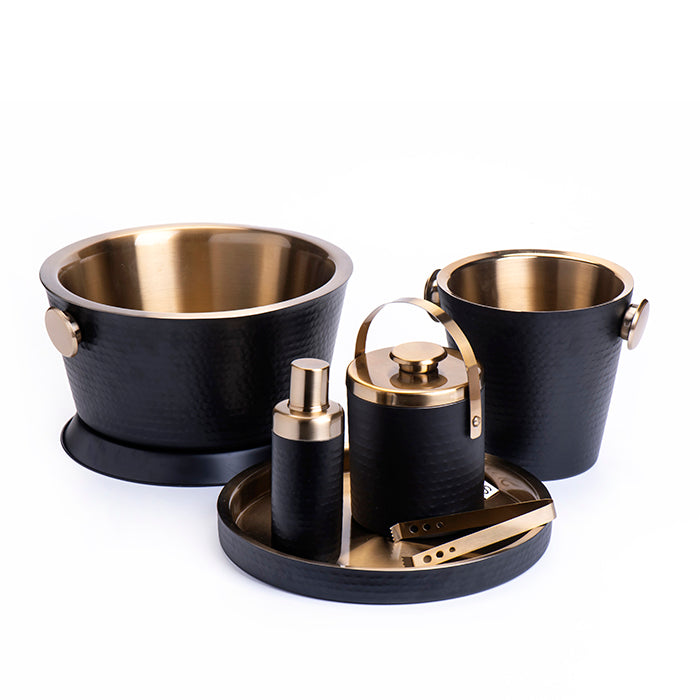 שייקר קוקטייל עשוי פלדת אל חלד בזהב ושחור. כלי קיבול מקצועי להכנת קוקטיילים בגימור ריקוע מעודן ועל זמני. שייקר זה הוא פריט מסדרת "קוקטייל" ב-קו אלגנטי זהב שחור.