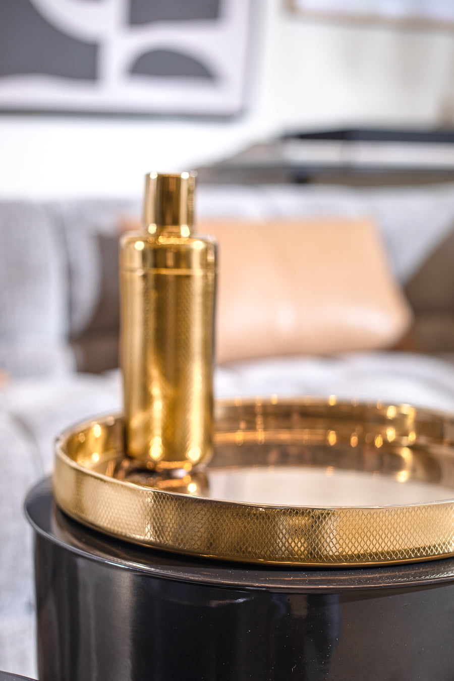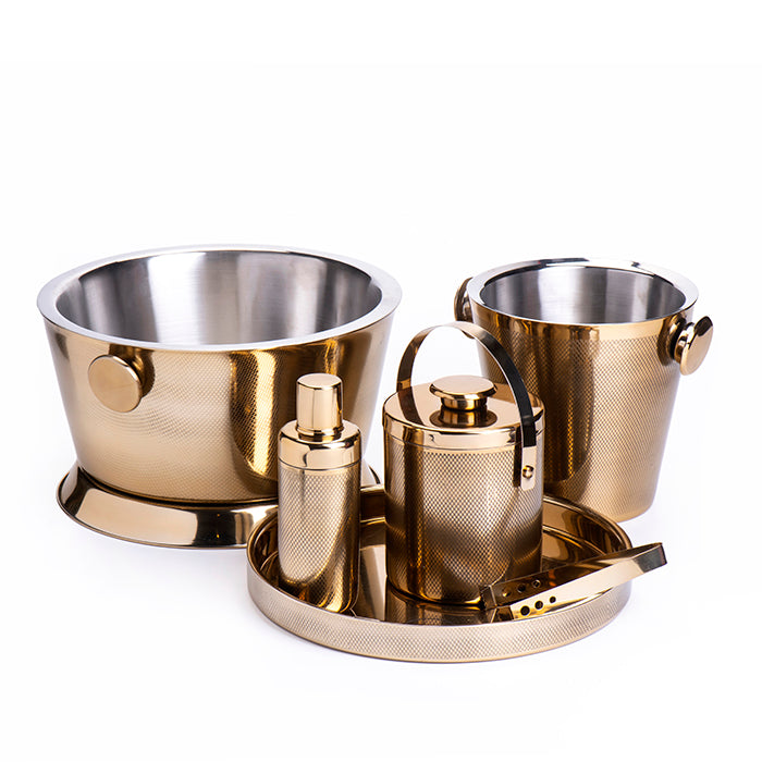 שייקר קוקטייל עשוי פלדת אל חלד בגוון מוזהב. כלי קיבול מקצועי להכנת קוקטיילים בדיגום גיאומטרי קלאסי. שייקר זה הוא פריט מסדרת "קוקטייל" ב-קו אלגנטי זהב שחור.