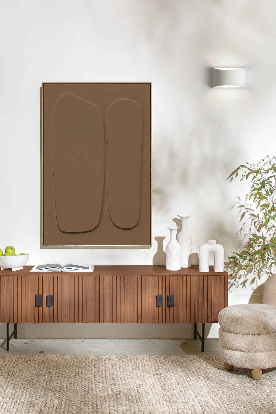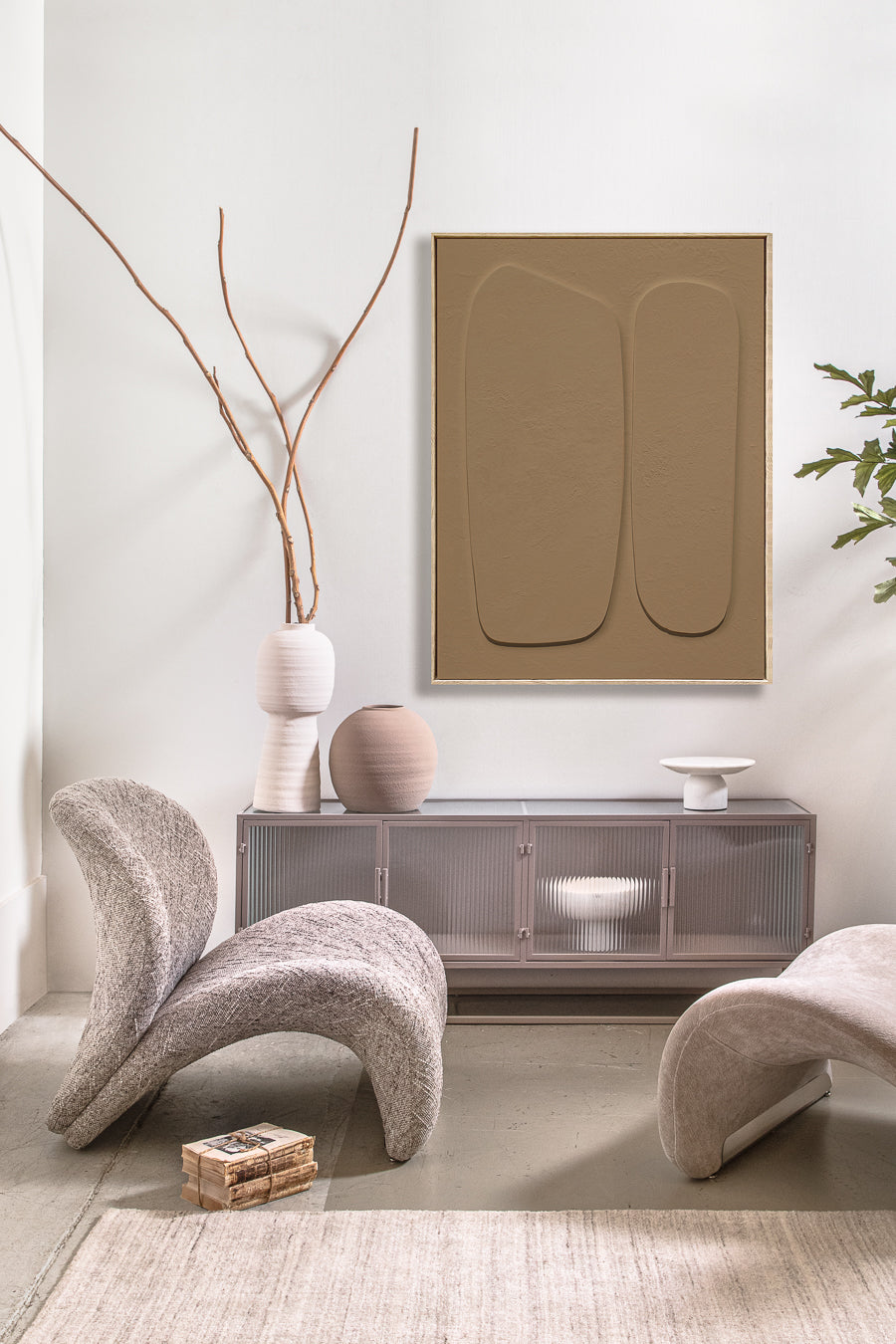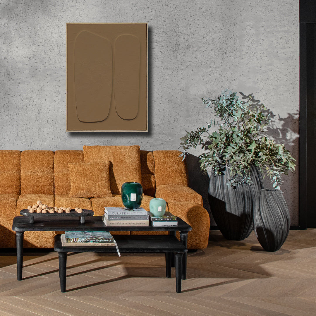 תמונת קנבס תבליט אליפס מלבנית בגוון חום. תמונת קיר בקומפוזיציית צורות אמורפיות ב-קו רך.