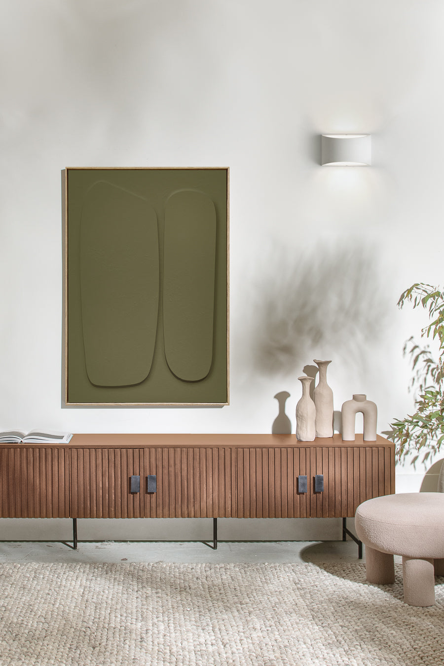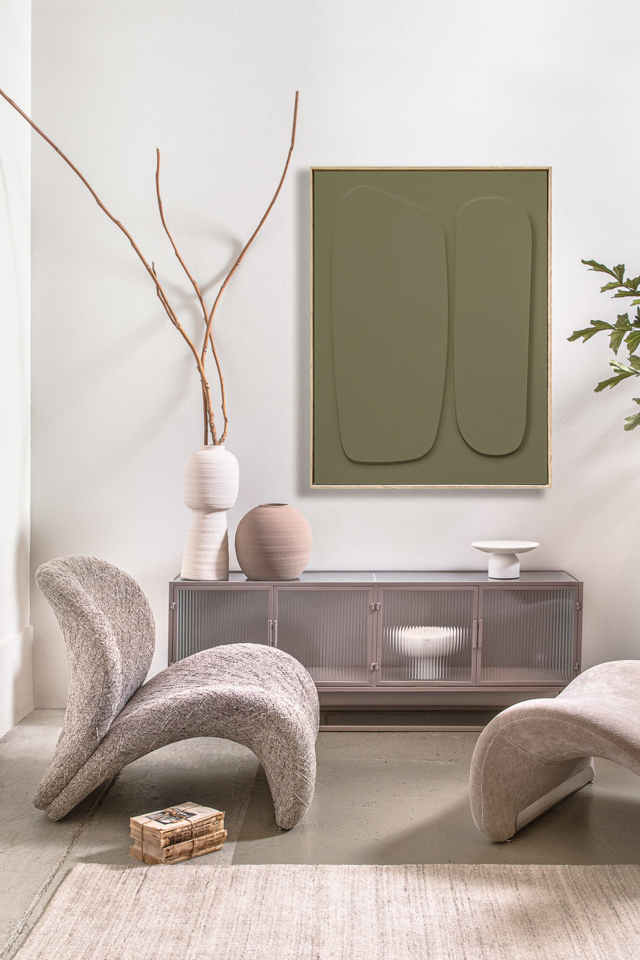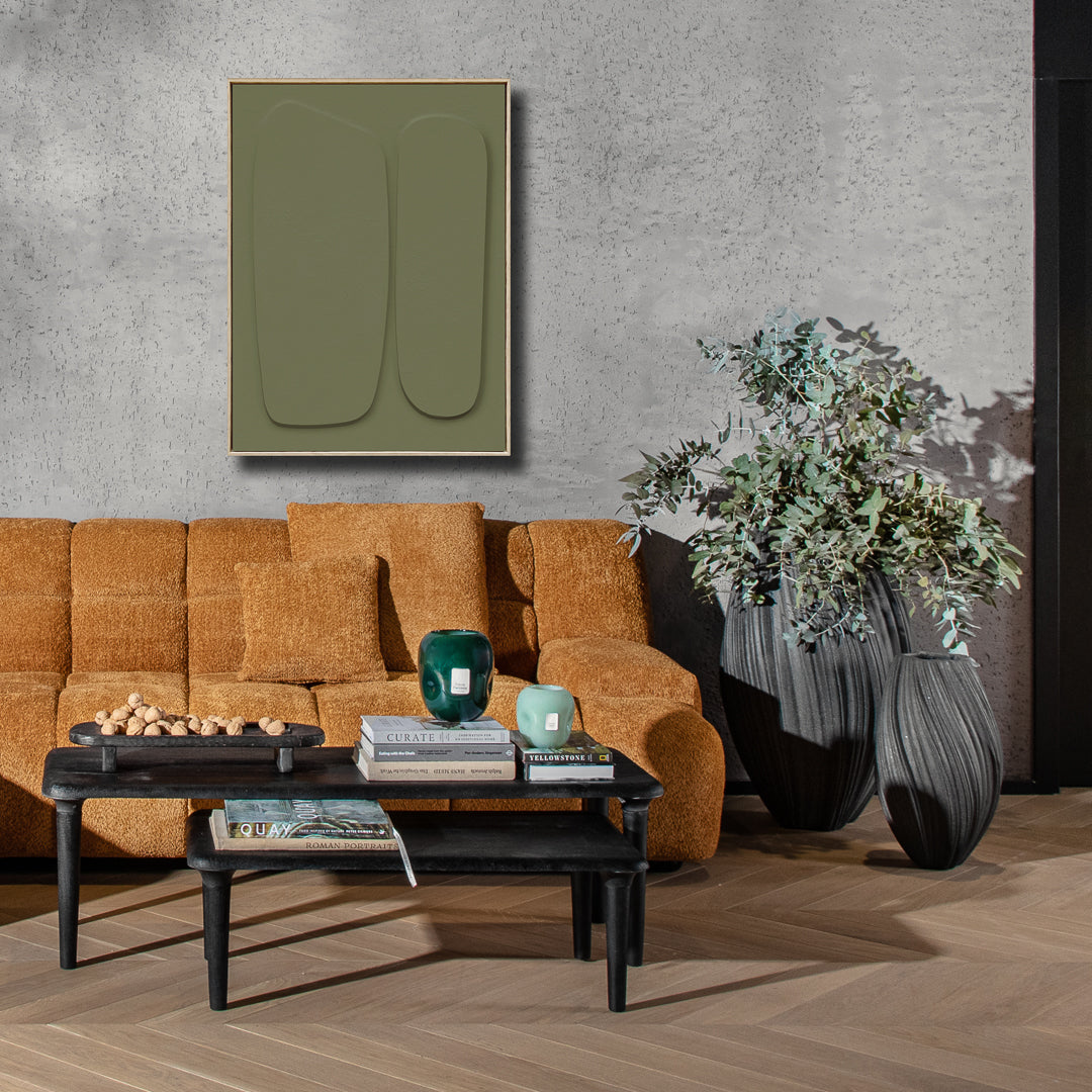 תמונת קנבס תבליט אליפס מלבנית בגוון ירוק. תמונת קיר בקומפוזיציית צורות אמורפיות ב-קו רך.