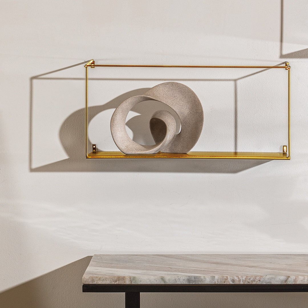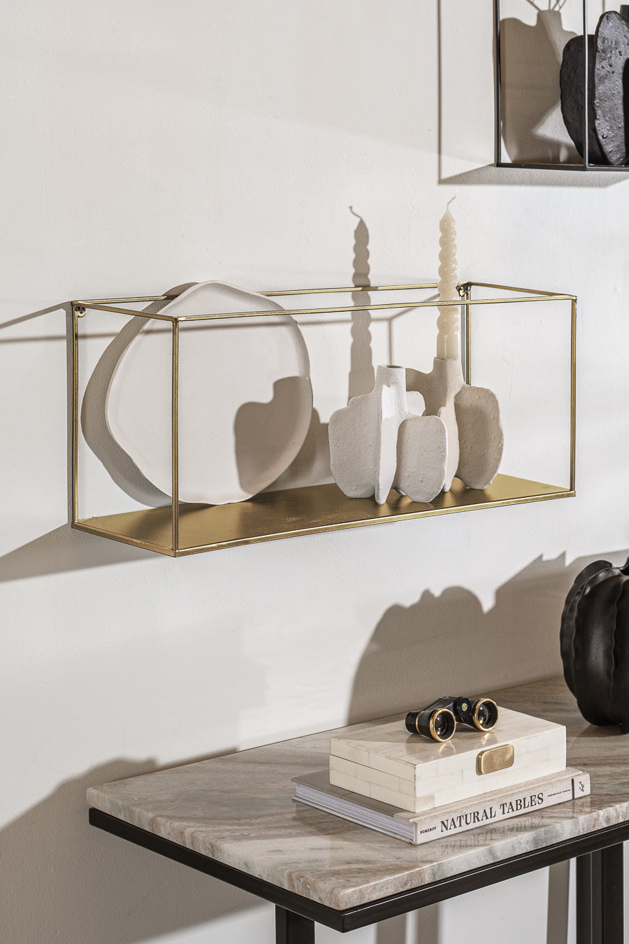 מדף קיר סווידיש מלבני בגוון מזהב. מידוף מתכת סקיני בקו תעשייתי. מדף מדוייק לאיבזור פינת הקריאה/ המשרד או מבואת הכניסה.