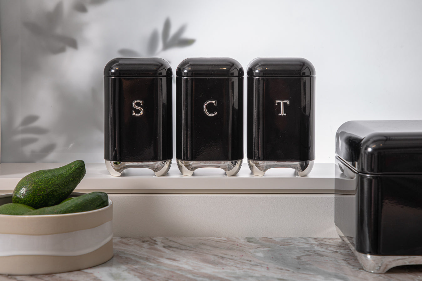 קופי שוגר טי בוקס בצבע שחור. סט לאיחסון תה/ קפה/סוכר בעיצוב רטרו שובה.