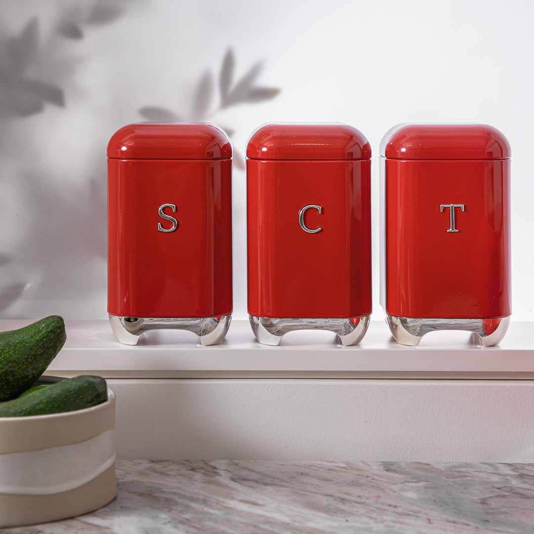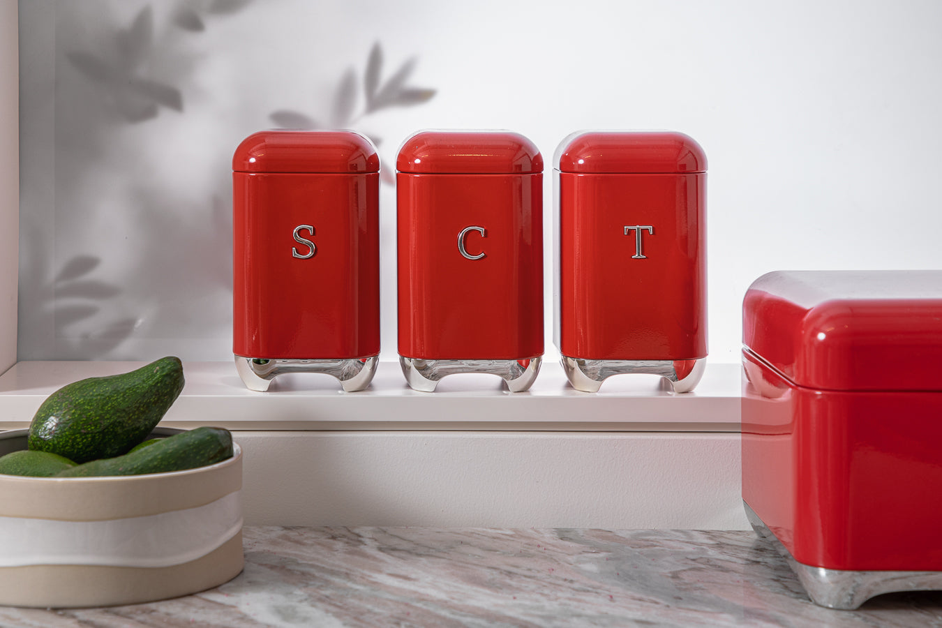 קופי שוגר טי בוקס בצבע אדום. סט לאיחסון תה/ קפה/סוכר בעיצוב רטרו שובה.
